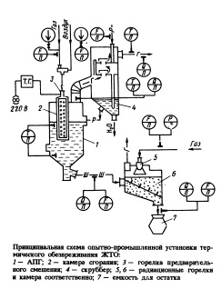 ТЕРМИЧЕСКОЕ ОБЕЗВРЕЖИВАНИЕ КОНЦЕНТРИРОВАННЫХ ЖИДКИХ ОТХОДОВ ТРАВИЛЬНЫХ И ГАЛЬВАНИЧЕСКИХ ОТДЕЛЕНИЙ МЕТАЛЛУРГИЧЕСКИХ ЗАВОДОВПредложена двухстадийная технология обезвреживания жидких токсичных отходов, включающая упарку стоков в аппарате погруженного горения и радиационную сушку шлама. Разработано оборудование для реализации предложенной технологии.Металлургическое производство относится к числу наиболее неэкологичных, отличается вредными условиями труда и большим количеством отходов. Жидкие отходы гальванических и травильных отделений металлургических и металлообрабатывающих заводов представляют собой большую опасность для окружающей среды, так как содержат высокотоксичные вещества, ионы тяжелых металлов и т.п. Жидкие токсичные отходы (ЖТО) составляют от 30 до 50% общего количества сточных вод (СВ) на предприятиях металлургии. Средний объем ЖТО в условиях одного производства составляет 600—800 мУсут. Ежегодно в окружающую среду выбрасывается до 1км3 токсичных ЖТО, содержащих 50 тыс.т тяжелых металлов, 100 тыс.т кислот и щелочей; 25—30 % этих стоков попадает в водные бассейны [1]. Обязательным требованием к очистке таких отходов является их полное обезвреживание с целью охраны почв и водоемов от тяжелых металлов и их солей. Авторами предложена технология термического обезвреживания ЖТО с получением солей тяжелых металлов, содержащихся в ЖТО в виде сухого остатка. Технология предусматривает термическое обезвреживание, проводимое в две стадии: упарка стоков в контактном концентраторе — аппарате погружного горения (АПГ); радиационная сушка упаренного в АПГ шлама до сухого остатка в радиационном доупаривателе (см. рисунок). Упариваемый раствор направляется в АПГ. Подача топливовоздушной смеси осуществляется в горелку, установленную в верхней части камеры сгорания. Доупарка ЖТО до состояния сухой массы проводится в радиационной камере, оснащенной горелкой. Топливом служит природный газ. Выбросы улавливаются в мокром скруббере. ![]()