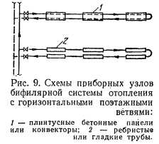 БИФИЛЯРНЫЕ СИСТЕМЫ ОТОПЛЕНИЯБифилярные системы отопления обеспечивают примерно одинаковую среднюю температуру поверхности отопительных приборов (подобно двухтрубным системам), а с точки зрения гидравлического режима являются однотрубными проточными системами отопления, отличающимися повышенной гидравлической устойчивостью. Однако, в бифилярных системах, так же как и в однотрубных системах с проточными приборными узлами, отсутствует возможность индивидуального количественного регулирования теплоотдачи отдельных отопительных приборов. ![]() Здесь приемлемо только количественное регулирование теплоотдачи группы приборов в ветви или при установке конвекторов с воздушным клапаном (типа «Комфорт») регулирование теплоотдачи каждого прибора по воздуху. Кроме того, в них не могут применяться широко распространенные чугунные и стальные радиаторы. Бифилярные системы отопления выполняются с вертикальными и с горизонтальными ветвями. Схемы с вертикальными бифилярными ветвями применяются, как правило, в крупнопанельном строительстве, а с горизонтальными — в зданиях различного назначения с плинтусными конвекторами, бетонными панелями, ребристыми и гладкими трубами [33]. На рис. 9 приведена схема части бифилярной системы отопления с отопительными приборами разных типов в горизонтальных поэтажных ветвях. |