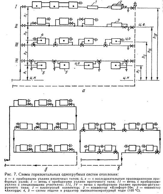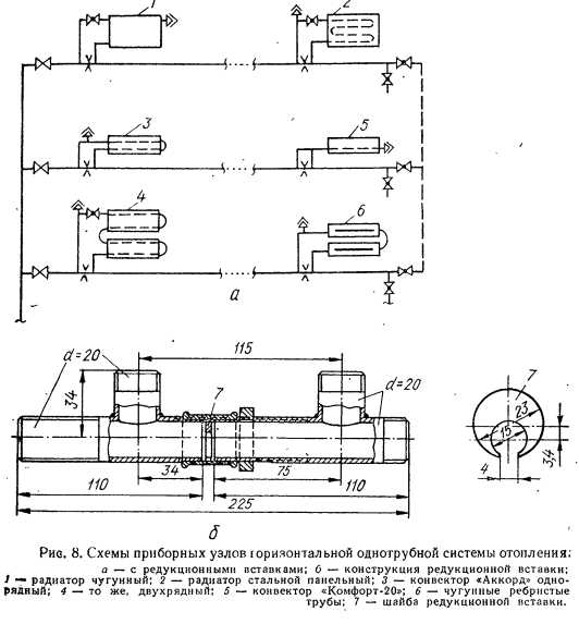ГОРИЗОНТАЛЬНЫЕ ОДНОТРУБНЫЕ СИСТЕМЫГоризонтальные однотрубные системы отопления с искусственной циркуляцией применяются в зданиях большой протяженности, в зданиях с периодическим отоплением помещений на разных этажах, при проектировании отопления в реконструируемых зданиях старой постройки (где недопустимо повреждение перекрытий) и в других случаях при соответствующем обосновании. Горизонтальные однотрубные системы отопления выполняются с разно- и односторонним присоединениями приборов к ветви, с проточными, проточно-регулируемыми приборными узлами и с замыкающими участками в горизонтальных ветвях (рис. 7). В, горизонтальных однотрубных системах отопления чаще всего применяются проточнорегулируемые приборные узлы с трехходовыми кранами, присоединяемые к горизонтальным поэтажным ветвям, прокладываемым или под окнами выше приборов (подоконная разводка) или у пола (плинтусная разводка). В первом случае нет необходимости устанавливать воздушные краны приборов, однако усложняется опорожнение приборе® и системы от воды. Горизонтальные приборные узлы проточного типа могут размещаться в помещениях, где теплоотдача приборов не регулируется, или при использовании конвекторов с воздушным клапаном (например типа «Комфорт-20»). Разновидностью горизонтальных однотрубных систем отопления с замыкающими участками, повышающими степень индустриализации заготовки и монтажа приборных узлов с отопительными приборами любого типа, является система с редукционными вставками, имеющими постоянные длины и диаметр (предложенная Мазо А. В.) (рис. 8, а). Редукционная вставка — единый стандартный элемент приборного узла, выполненный из труб диаметром условного прохода dy — 20 мм, с дросселирующей шайбой, имеющей эксцентрично расположенное отверстие диаметром 15 мм и вырез для фиксации в указанном на рис. 8, б положении. Такая конструкция позволяет осуществлять одностороннее присоединение отопительных приборов к горизонтальным ветвям при движении теплоносителя в них по наиболее экономичной схеме «сверху — вниз» и обеспечивает постоянный и повышенный коэФфициент затекайия воды в приборы. Для помещений, в которых теплоотдача приборов не регулируется, Допускается применение узлов с редукционными вставками без регулирующей арматуры. При проектировании систем отопления с редукционными вставками следует учитывать, что все элементы приборного узла (ответвления и редукционная вставка) при любых отопительных приборах изготавливаются из труб диаметром условного прохода dy ~ 20 мм с установкой крана КРП dy — 20 мм, а горизонтальные ветви прокладываются над полом помещения без уклона и выполняются, как правило, из Труб одного диаметра: 15, 20 или 25 мм с установкой в местах их присоединения к вертикальным сборным участкам запорной и спускной арматуры. На горизонтальных ветвях через каждые 12—15 м необходимо предусматривать установку П-образных компенсаторов или использовать огибы колонн в здании. Для удаления воздуха из отопительных приборов в верхних футорках чугунных радиаторов, на кон- екторах «Комфорт», «Ритм» и на ответвлениях к другим приборам следует устанавливать воздуховыпускные краны (краны Маевского). ![]() ![]() Наиболее просты и экономичны горизонтальные однотрубные системы отопления с искусственной циркуляцией в одноэтажных зд