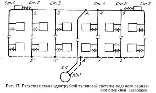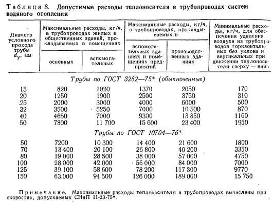 ОСНОВНЫЕ ПРИНЦИПЫ И ПОСЛЕДОВАТЕЛЬНОСТЬ ГИДРАВЛИЧЕСКОГО РАСЧЕТАГидравлическим расчетом трубопроводов систем водяного отопления обосновывается выбор диаметров труб с учетом технико-экономических соображений и условий бесшумности при использовании располагаемой разности давлений на вводе в здание. Прежде чем приступить к гидравлическому расчету трубопроводов, необходимо: определить тепловую мощность системы отопления и тепловую нагрузку отопительных приборов для отдельных помещений; с учетом параметров теплоносителя выбрать принципиальную схему системы отопления, тип и способ установки отопительных приборов; конструктивно решить систему отопления — на планах здания разместить отопительные приборы, стояки, распределительные и сборные магистрали, воздухосборники и т. д.; в масштабе 1 : 100 вычертить аксонометрическую схему системы отопления; определить расчетное циркуляционное давление Дрр для системы отопления. Как правило, для зданий более двух этажей вычерчивают не аксонометрическую схему системы отопления, а отдельную схему (развертку) стояков с отопительными приборами и аксонометрические схемы распределительных и сборных магистралей (при нижней разводке эти схемы совмещают). Для учета местных сопротивлений на схемах показывают запорно-регулирующую арматуру, устройства для спуска воды и удаления воздуха, компенсаторы, изгибы трубопроводов, за исключением отступов на стояках и уток на ответвлениях к отопительным приборам. На планах этажей и аксонометрической схеме системы отопления стояки нумеруют по часовой стрелке по периметру здания, начиная с помещения, расположенного в верхнем левом углу плана здания. На схеме системы отопления нумеруются также расчетные участки трубопроводов циркуляционных колец. Расчетным участком трубопровода считается участок постоянного диаметра с неизменным расходом теплоносителя. Количество циркуляционных колец в двухтрубной системе водяного отопления равно числу отопительных приборов (отопительные приборы, соединенные на «сцепке» в тепловом и гидравлическом расчете, рассчитываются как один прибор). В однотрубных системах отопления количество циркуляционных-колец равно числу стояков или горизонтальных приборных ветвей. На схеме системы отопления указывают порядковый номер, а также тепловую нагрузку Q и длину I каждого расчетного участка трубопроводов Гидравлический расчет трубопроводов, как правило, начинают с основного циркуляционного кольца, после чего рассчитывают остальные кольца. В качестве основного принимают кольцо, для которого отношение расчетной разности давлений Дрр к сумме длин расчетных Участков S I является минимальной величиной. Для различных систем отопления основное циркуляционное кольцо принимают по-разному: в двухтрубных вертикальных системах водяного отопления оно проходит через нижний отопительный прибор наиболее нагруженного и удаленного от теплового центра стояка при тупиковой разводке магистралей, а при попутном движении воды в магистралях — через нижний прибор наиболее нагруженного среднего стояка. В однотрубных вертикальных системах отопления основное циркуляционное кольцо проходит при тупиковой схеме через максимально нагруженный из наиболее удаленных от теплового центра стояк, а при попутном движении воды в маги