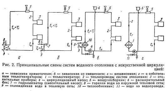 ПРИНЦИПИАЛЬНЫЕ СХЕМЫ СИСТЕМ ОТОПЛЕНИЯПри водяном централизованном теплоснабжении применяются три основные схемы систем отопления с искусственной циркуляцией: зависимая прямоточная, зависимая со смешением и независимая. При выборе схемы системы отопления учитывают следующие факторы: температуру воды в тепловой сети; давление в магистралях тепловой сети, зависящее от давления, развиваемого сетевыми насосами (на ТЭЦ или котельной), от протяженности сети, рельефа местности и др.; перепад давлений в подающей и обратной магистралях тепловой сети и т. д. Наиболее распространены схемы зависимых систем отопления с искусственной циркуляцией. Необходимым условием для применения прямоточной схемы системы отопления (рис. 2, а) является возможность непосредственного использования теплосетевой воды в системе отопления абонента. Причем в месте присоединения системы отопления к тепловой сети гидростатическое давление в обратной магистрали не должно превышать давления, - допустимого для отопительных приборов системы отопления. Зависимая прямоточная схема проста по конструкции и в обслуживании. В связи с использованием высокотемпературной воды она имеет минимальную металлоемкость и стоимость. Недостатком рассматриваемой схемы является влияние теплового и гидравлического режимов системы теплоснабжения на работу системы отопления, а также невозможность местного качественного регулирования параметров теплоносителя. ![]() Зависимая схема системы отопления со смешением воды (рис. 2, б) широко применяется-в гражданских и промышленных зданиях, так как в этом случае в системе отопления обеспечиваются требуемые расчетные параметры воды за счет подмешивания к высокотемпературной воде, поступающей из системы теплоснабжения, охлажденной воды из сборной магистрали системы отопления. Эта схема используется, если гидростатическое давление в тепловой сети не превышает допустимой величины для отопительных приборов системы отопления. Смешивает воду с помощью смесительных установок с элеваторами типа ВТИ [23] или насосами типа IТRII [14]. Установки с элеватором широко распространены, так как они просты в конструктивном исполнении и безотказны в работе. Они не только снижают температуру воды, поступающей в систему отопления, но и обеспечивают в ней циркуляцию. Для нормальной работы элеватора необходимо, чтобыразность давлений в подающем и обратном трубопроводах тепловой сети на вводе в здание Артх была достаточна для преодоления гидравлических сопротивлений элеватора и системы отопления (обычно Артс = = 0,08-0,12 МПа). Основными недостатками схем с элеватором являются: зависимость работы системы отопления от гидравлического режима системы теплоснабжения и при нерегулируемых соплах элеваторов — неизменность коэффициента подмешивания воды. Для устранения последнего недостатка используют элеваторы с автоматическим регулированием производительности (регулируемым соплом) в комплекте с манометрической термосистемой РТ-2217-ЭР или автоматизированные элеваторы «Электроника Р-1» [11], дающие до 15 % экономии тепловой энергии в год. При недостаточном перепаде давлений на вводе тепловой сети в зда ние А/?т.е или же при его изменениях во время эксплуатации, вызывающих разрегулировку системы отопления, в зданиях повышенной этажности (более 9 этаже