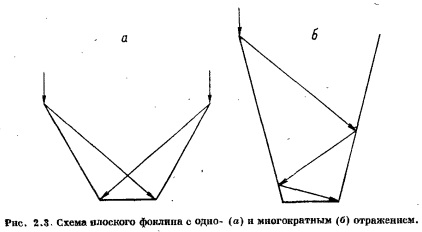 Указанный, недостаток существенно в меньшей степени проявляется в отражателях с прямолинейными образующими или так называемых плоских фоклинах, однако такие концентраторы при однократном отражении солнечного излучения (рис. 2.3, а) не позволяют получать степени концентрации > 3, что в некоторых случаях не •обеспечивает требуемых характеристик системы преобразования энергии СКЭС. Более высокой концентрирующей способностью обладают Плоские фоклины с многократным отражением солйечного излучения (рис. 2.3, 6). Анализ показал, что при коэффициентах концентрации порядка 2—5, характерных для систем с пассивно охлаждаемыми фотопреобразователями, плоские фоклины вполне конкурентоспособны по отношению к параболоцилиндрическим с точки зрения массогабаритных показателей и имеют очевидные преимущества в отношении равномерности распределения сконцентрированного излучения по лучевоспринимающей поверхности. Последнее обстоятельство имеет очень важное значение для обеспечения высоких энергоэкономических показателей системы преобразования солнечной, энергии.