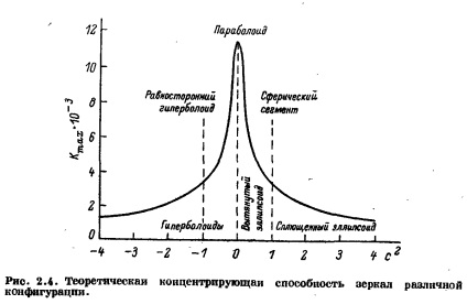 На рис. 2.6 представлены кривые, характеризующие изменение рабочей температуры в зависимости от коэффициента концентрации при различных значениях т для приемника со свойствами абсолютно черного тела. Из рисунка видно, что для получения температур порядка 1000—2000 К при КПД приемника, равном 0.8, требуемая степень концентрации солнечного излучения составляет от нескольких сот до нескольких тысяч. Такие уровни концентрации на СКЭС можно обеспечить лишь с помощью отражателей квазипараболоидной конфигурации. Грилихес В. А. Солнечные космические энергостанции — Л.: Наука, 1986. — 182 с. |