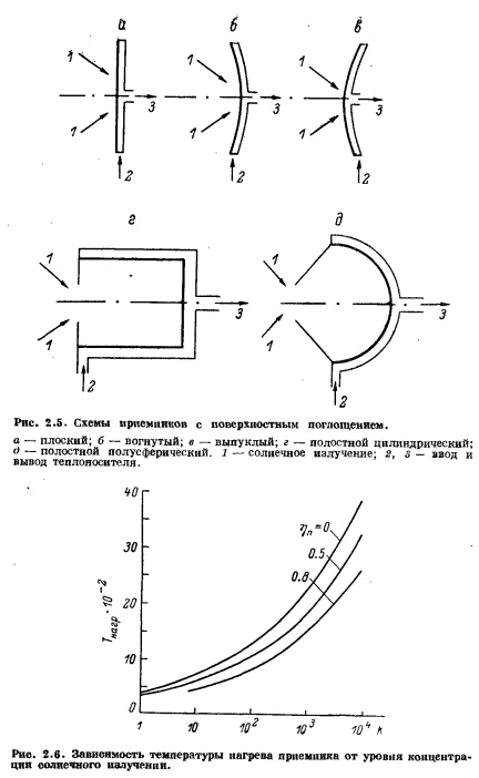 Основкые потери энергии с отражением и собственным излучением их лучевоспринимающих поверхностей, вследствие чего общая энергетическая эффективность (КПД) приемника в знaчительной степени зависит от организации процессов лучистого обмена. Именно этим обусловлена целесообразность использования в СВИТ полостных приемников, обладающих значительно более высокой эффективной поглощательной способностью aR по сравнению с приемниками открытого типа. У полостных приемников выше и эффективная излучательная способность ёп, что несколько снижает их преимущества. Тем не менее потери, связанные с отражением, обычно преобладают над потерями изза теплового излучения, вследствие чего полостные конструкции в целом оказываются предпочтительнее. Рабочая температура приемника СВИТ определяется степенью концентрации солнечного излучения, эффективными значениями поглощательной и излучательной способности приемника и его КПД