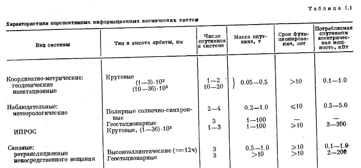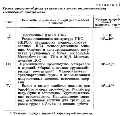 Потребности производства энергии в космосеПрежде чем переходить к обсуждению вопросов развития космической энергетики, следует оценить, сколько энергии и для чего нужно будет вырабатывать в космосе в ближайшие годы и десятилетия. С этой целью необходимо кратко проанализировать тенденции развития различных космических систем и попытаться определить, как должны изменяться энергозатраты, связанные с их размещением в космосе и использованием по назначению. При классификации космических систем будем исходить из общесистемных принципов, согласно которым в больших системах любой сложности всегда циркулируют три вида потоков — информации, массы (вещественной продукции) и энергии. Информационные космические системы Все автоматические космические аппараты, которые были созданы до настоящего времени и существуют сейчас в космосе, можно отнести к классу информационных космических , аппаратов (ИКА), поскольку их целевое назначение сводится в конечном итоге к получению, накоплению, обработке и передаче различной информации. Такие аппараты могут функционировать на околоземных орбитах, совершать полеты к Луне, Солнцу и планетам солнечной системы. Однако наиболее весомый вклад в решение земных проблем дают орбитальные ИКА — искусственные спутники Земли (ИСЗ), которые благодаря рвоей глобальности значительно расширяют возможности получения и передачи информации. ИСЗ народнохозяйственного назначения сегодня успешно решают задачи связи и навигации, геодезического и метеорологического обеспечения, наблюдения за поверхностью Земли и др. Их применение имеет широкие перспективы дальнейшего развития, так как существенно повышает эффективность многих направлений человеческой деятельности, и становится все более рентабельным,Развитие орбитальных ИКА идет по пути совершенствования их специального бортового оборудования, его комплексирования, повышения надежности и ресурса. Удлиняются сроки активного функционирования ИКА, растет высота их рабочих орбит. Все это влечет за собой увеличение энергозатрат, связанных с размещением ИКА в космическом пространстве и их эксплуатацией, приводит к возрастанию потребляемой на борту аппаратов электрической мощности. Для решения различных задач с помощью ИКА обычно используется группа аппаратов, образующая информационную космическую систему (ИКС). В соответствии с целевым назначением все ИКС подразделяют на три вида [2]: — координатно-метрические, включающие геодезические и навигационные системы;— наблюдательные, которые объединяют метеорологические системы и системы для исследования природных ресурсов Земли и окружающей среды (ИПРОС); — связные, включающие системы ретрансляции телефонно-телеграфной радиовещательной, телевизионной и прочей информации, а также системы непосредственного телевизионного и радиовещания. Для всех этих систем характерны различные уровни потребления энергии спецаппаратурой ИКА, различные энергозатраты на их развертывание и обслуживание. В табл. 1.1 обобщены параметры перспективных ИКС, на основании которых можно оценить основные энергозатраты, связанные с их созданием и эксплуатацией [20, 34, 69]. Как следует из таблицы, потребление энергии на борту большей части ИКА сравнительно невелико и в будущем, вероятно, не превысит единиц—десятков килова