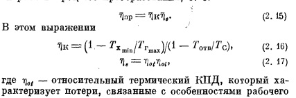 Преобразователи тепловой энергии солнечного излученияВ тепломеханических преобразователях тепловая энергия подводится к рабочему телу, находящемуся в газообразном или жидком состоянии, и превращается в механическую энергию в газовом или парожидкостном цикле. Механическая энергия в дальнейшем может быть преобразована в электрическую с помощью машинного электрогенератора. Теплоэлектрические преобразователи можно разделить на две подгруппы. К первой из них относятся статические преобразователи, в которых превращение тепла в электро энергию осуществляется за счет различных физических эффектов в твердом теле. К числу таких эффектов относятся термоэлектронная эмиссия, термоэлектрические явления, а также термодиэлектрические и термомагнитные эффекты. Вторую подгруппу образуют динамические преобразователи, среди которых наибольший интерес для космической знергетики представляют магнито и элек трогазодинамические генераторы. В преобразователях этих типов тепловая энергия используется для ионизации и разгона рабочего тела, взаимодействие которого с магнитным или электростатическим полем приводит к генерации электрической энергии. Имея в виду, что важнейшим требованием к системам преобразования энергии СКЭС является требование высокой энергетической эффективности, рассмотрим преобразователи тепловой энергии прежде всего с этой точки зрения. Эксергетический КПД, характеризующий энергетическое совершенство преобразователей тепловой энергии солнечного излучения, определяется произведением относительного КПД цикла Карно в диапазное максимальной и минимальной рабочих температур преобразователя и так называемого коэффициента использования, учитывающего все необратимые потери энергии в процессе преобразования, т. е.