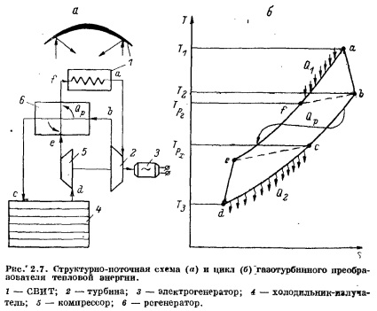 В паротурбинных преобразователях (ПТП) значительная часть тепла подводится и отводится в изотермических процессах фазовых переходов рабочего тела из жидкого состояния в парообразное, что значительно повышает их относительный термический КПД Данное обстоятельство в сочетании со сравнительно малыми затратами мощности турбины на привод насоса, который осуществлял повышение давления и прокачку рабочего тела в контуре, определяет возможность получения в ПТП, реализующих цикл Ренкина, более высоких значений коэффициента использования 1=0.5—0.6. Соответственно в преобразователях этого типа при относительно низких средних значениях температуры теплоподвода (до 1000 К) и умеренных перепадах температур могут быть достигнуты достаточно большие значения эффективного КПД (20— 30 %), возрастающие при увеличении мощности установки. Этим и обусловлены основные преимущества ПТП передпреобразователями, работающими по циклу Брайтона.