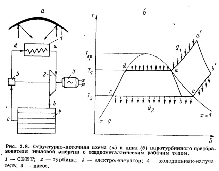 Эффективность ПТП в значительной степени зависит от свойств рабочего тела, в качестве которого могут использоваться вода, жидкие металлы и органические соединения. Вода при умеренных температурах подвода тепла имеет слишком большое давление насыщенного пара, что неприемлемо с точки зрения требований к массогабаритным показателям и надежности систем преобразования энергии СКЭС. Жидкие металлы обладают превосходным сочетанием термодинамических и теплофизических свойств, обеспечивающих высокие значения относительного термического КПД ПТП и компактность элементов теплообменного оборудования, На рис. 2.8 представлены структурнопоточная схема ПТП и диаграмма цикла Ренкина на щелочных металлах. Характерной особенностью таких ПТП является возможность их реализации в одноконтурном исполнении. Обусловлено это тем, что высокие значения коэффициентов теплоотдачи щелочных металлов исключают необходимость введения дополнительных жидкостных контуров для передачи тепла от СВИТ или к холоди л ьникуизлучателю, как это приходится делать в системах с ГТП изза низкой интенсивности теплообмена между газом и поверхностями соответствующих устройств. Для ПТП в общем случае возможны два режима работы — на влажном и на сухом паре. В зависимости от вида рабочего тела работа на сухом паре может осуществляться с перегревом или без него. В жидкометаллических ПТП (рис. 2.8) при работе турбин на влажном паре цикл наиболее близок к циклу Карно и состоит из двух изотерм (d—а и b—с) и двух политроп (с—d и а—Ь). Линии, характеризующие отдельные процессы в цикле, не выходят за пределы линии насыщения пара (линия х=1 на рис. 2.8, б). В этом случае относительный термический КПД преобразователя близок к единице, но трудно обеспечить высокую энергетическую эффективность и надежность турбины, работающей в парах щелочных металлов. Чтобы турбина работала на сухом паре, осуществляют его перегрев по изобаре а—а (рис. 2.8, б). Расширение пара на турбине происходит по политропе, а отвод тепла — по изобаре V—е и замыкающей цикл изотерме КПД и надежность турбины в данном случае будут выше, чем при ее работе на влажном паре, но понижается относительный термический КПД цикла и возрастает температура подвода тепла, а следовательно, ужесточаются требования к СВИТ, что нежелательно. С учетом зтого обстоятельства для систем преобразования энергии СКЭС предпочтение может быть отдано жидкометаллическим ПТП на влажном паре, использующим в качестве рабочего тела щелочные металлы, например калий или цезий. Их эффективный КПД должен быть приблизительно таким же, как и у ГТП, т. е. достигать 25—30 %, но при меньшем перепаде температур, обеспечивающем лучшие массогабаритные показатели системы преобразования в целом. Основные недостатки жидкометаллических ПТП связаны с агрессивностью щелочных металлов по отношению к конструкционным материалам, их токсичностью, взрыво й пожароопасностью, что затрудняет обеспечение требуемой надежности, ресурса и безопасности эксплуатации системы преобразования энергии СКЭС. Более перспективными в этом отношении могут оказаться ПТП с органическими рабочими телами (ОРТ). Низкое давление насыщенных паров при достаточно высоких температурах кипения, хорошая совместимость с конструкционными материалами, нетоксичность и взрыво безопасно