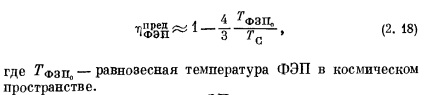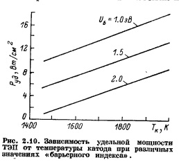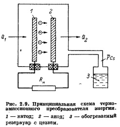 При работе ТЭП в его межэлектродном зазоре образуется пространственный заряд с отрицательным потенциалом, для преодоления которого электроны должны иметь избыток кинетической энергии. С целью снижения или устранения влияния пространственного потенциального барьера в межэлектродный зазор вводятся ионизированные пары щелочного металла — цезия. Для этого вакуумированная полость электродов соединяется с подогреваемым резервуаром, содержащим жидкий цезий. Для поддержания требуемой температуры катода к нему от СВИТ должна непрерывно подводиться тепловая мощность высокой плотности. Подводимое тепло компенсирует унос энергии электронами (так называемое «электронное охлаждение»), а также потери тепла излучением на анод й теплопроводностью через токопроводы. Испускаемые катодом электроны и излучение нагревают анод, который при высокой температуре также способен эмиттировать электроны. Их попадание на катод приводит к уменьшению тока во внешней цепи. Поэтому тепло от анода должно постоянно отводиться для поддержания более низкой, чем у катода, температуры. С другой стороны, нужно учитывать, что основные необратимые потери энергии в ТЭП связаны с лучистым теплообменом между катодом и анодом. Для их уменьшения температура анода не должна быть много ниже температуры катода, а следовательно, возможности повышения эффективного КПД ТЭП за счет снижения температуры отводатепла (т. е. КПД Карно) огрaнничены. Характерные значения температуры катода ТЭП составляют 1700—2000 К, а температуры анода 900—1000 К. Значение коэффициента использования, в этом температурном диапазоне для перспективных конструкций ТЭП достигает 0.4—0.5. Высокий уровень температуры подвода тепла затрудняет применение ТЭП в системах преобразования энергии СКЭС изза чрезмерно высоких требований к точностным характеристикам концентраторов солнечного излучения и связанного с зтим увеличения их массы. Однако этот недостаток частично компенсирует высокая температура теплоотвода, позволяющая существенно снизить размеры и массу холодильника излучателя.