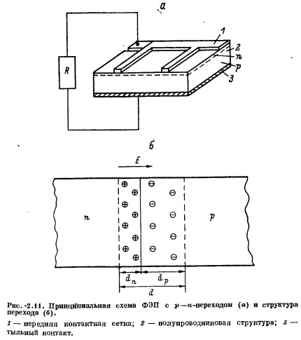 При характерной для ФЭП равновесной температуре порядка 300—350 К превышает 90 %. Это означает, что, если в результате оптимизации структуры и параметров преобразователя, направленной на снижение необратимых потерь энергии, удастся поднять его зксерге тический КПД до значений 0.5—0.6, эффективный КПД достигнет 50 % и более, т. е. существенно превысит эффективный КПД любого из рассмотренных выше преобразователей тепловой энергии солнечного излучения. Теоретические исследования [30] и практические разработки [3, 35, 43] в области фотоэлектрического преобразования солнечной энергии подтвердили возможность реализации столь высоких значений КПД с ФЭП и определили основные пути достижения этой цели. Преобразование энергии в ФЭП основано на фотоволь таическом эффекте, который возникает в неоднородных полупроводниковых структурах при воздействии на них солнечного излучения. Неоднородность структуры ФЭП может быть получена легированием одного и того же полупроводника различными примесями (создание р—п переходов) или путем соединения различных полупроводников с неодинаковой шириной запрещенной зоны (создание гетеропереходов), или же за счет изменения химического состава полупроводника, приводящего к появлению градиента ширины запрещенной зоны (создание варизонных структур). Возможны также различные комбинации перечисленных способов. Эффективность преобразования зависит от электрофизических характеристик неоднородной полупроводниковой структуры, а также оптических свойств ФЭП, среди которых наиболее важную роль играет фотопроводимость, обусловленная явлениями внутреннего фотоэффекта в полупроводниках при облучении их солнечным светом. Принцип работы ФЭП можно пояснить на примере преобразователей с р—n-переходом, которые наиболее широко применяются в современной космической энергетике. Схема ФЭП с р—переходом изображена на рис. 2.11. Электроннодырочный переход создается путем легирования пластинки монокристаллического полупроводникового материала с определенным типом проводимости (т. е. р или тгтипа) примесью, обеспечивающей создание поверхностного слоя с проводимостью противоположного типа. Концентрация легирующей примеси в этом слое должна быть значительно выше, чем концентрация примеси в базовом материале, чтобы нейтрализовать имеющиеся там основные свободные носители заряда и создать проводимость противоположного знака. У границы п и pслоев в результате перетечки зарядов образуются обедненные зоны с нескомпенсированным объемным положительным зарядом в гаслое и объемным отрицательным зарядом в pслое. Эти зоны в совокупности иобразуют р—nпереход (рис. 2.11, б). Возникший на переходе потенциальный барьер (контактная разность потенциалов) препятствует прохождению основных носителей заряда, т. е. электронов со стороны /гслоя и дырок со стороны pслоя, но беспрепятственно пропускает неосновные носители в противоположных направлениях. Это свойство р—nперехода и определяет возможность получения фотоЭДС при облучений ФЭП солнечным светом.