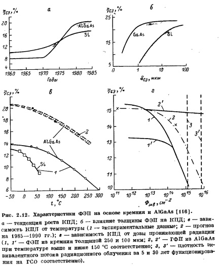 Такая высокая производительность может быть достигнута только при организации полностью автоматизированного производства ФЭП, например на основе ленточной технологии, и создании развитой сети специализированных предприятий соответствующего профиля, т. е. фактически целой отрасли промышленности, соизмеримой по масштабам с современной радиоэлектронной промышленностью. В качестве наиболее вероятных материалов для фотоэлектрических систем преобразования солнечной энергии СКЭС в настоящее время рассматриваются кремний и арсенид галлия (GaAs), причем в последнем случае речь идет о гетерофотопреобразователях (ГФП) со структурой AlGaAs—GaAs. ФЭП на основе GaAs, как известно, имеют более высокий, чем кремниевые ФЭП, теоретический КПД, так как ширина запрещенной зоны у них практически совпадает с оптимальной шириной запрещенной зоны полупроводниковых преобразователей солнечной энергии. Реально достигнутые значения КПД ГФП на основе GaAs в настоящее время еще ненамного превышают КПД лучших образцов кремниевых преобразователей, однако темпы и перспективы из увеличения являются весьма обнадеживающими (рис. 2.12, а) [116]. Предполагается, что КПД кремниевых ФЭП для СКЭС в 1985—1990 гг. может достичь 14—16 %, в то время как для ГФП ожидают получить КПД 18—20 % и более. Вследствие высокого уровня поглощения солнечного излучения, определяемого прямыми оптическими переходами в GaAs, высокие КПД ФЭП на их основе могут быть получены при значительно меньшей по сравнению, с кремнием толщине ФЭП (рис. 2. 12, б). Принципиально достаточно иметь толщину ГФП 5—6 мкм для получения КПД порядка 20 %, тогда как толщина кремниевых элементов не может быть менее 50—100 мкм без заметного снижения их КПД. Это обстоятельство позволяет рассчитывать на создание легких пленочных ГФП, для производства которых потребуется сравнительно мало исходного материала, особенно если в качестве подложки удастся использовать не GaAs, а другой материал, например синтетический сапфир (А1203). Высокие значения КПД и малая толщина ГФП на основе GaAs создают предпосылки для существенного снижения размеров и массы СКЭС с преобразователями такого типа, так как, например, уменьшение толщины ФЭП всего на 1 мкм при площади солнечных батарей (СБ) станции порядка 100 км2 позволяет сэкономить 100 м8 полупроводникового материала.