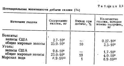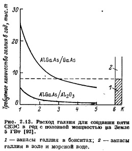 В отличие от кремния галлий является весьма дефицитным материалом, что ограничивает возможности создания ГФП на основе GaAs в количествах, необходимых для СКЭС. Галлий добывается в основном из бокситов, однако рассматривается также возможность его получения из угольной золы и морской воды (табл. 2.3). Как видно из таблицы, самые большие запасы галлия содержатся в морской воде, однако концентрация его там очень невелика, выход при извлечении оценивается величиной всего в 1 %, а следовательно, затраты на производство будут, вероятно, чрезмерно большими. Так, например, только прокачка воды для добычи 1 кг галлия, по оценкам авторов работы [116], будет стоить примерно 7000 долл.