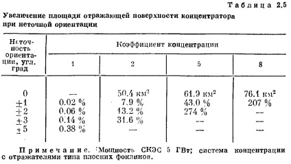 В табл. 2.4 [116] показана зависимость температуры ГФП на основе GaAs от коэффициента концентрации для систем без покрытия и с селективно отражающим покрытием. Из данных таблицы следует, что в таких системах при наличии селективного покрытия можно использовать пятикратную концентрацию солнечного излучения при уровне рабочей температуры преобразователей около 125 °С. Дополнительная возможность увеличения коэффициента концентрации связана с применением покрытий, обладающих высокой излучательной способностью, которые могут наноситься на освещенную и тыльную поверхности СБ, обеспечивая снижение их равновесной температуры. В этом случае коэффициент концентрации в системах на основе ГФП из GaAs может быть увеличен до 10 при рабочей температуре, не превышающей 150 °С. Следует, однако, иметь в виду, что выбор оптимальных параметров системы концентрации для фотоэлектрических систем преобразования энергии СКЭС не определяется влиянием повышения плотности излучения только на энергомассовые характеристики ФЭП. С увеличением коэффициента концентрации, как известно, возрастают требования к точности ориентации системы на Солнце, либо для обеспечения требуемой концентрации при неточной ориентации необходимо увеличивать площадь отражающей поверхности, чтобы скомпенсировать эту неточйость. Табл. 2.5 [117] содержит расчетные данные о требуемом увеличении площади отражателя при различных коэффициентах концентрации и углах разориентации. Из таблицы, в частности, видно, что при коэффициенте концентрации больше 5 и любом угле разориентации либо угле разориентации +1° и коэффициенте концентрации 8 площадь отражающей поверхности должна быть увеличена более чем на 200 %, чтобы обеспечить требуемую плотность падающего излучения на поверхности СБ. Такое увеличение площади концентратора приведет к возрастанию массы системы преобразования, а увеличение точности ориентации связано с возрастанием расхода энергии и массы рабочего тела в системе ориентации .станции. Все это неизбежно увеличит стоимость создания и эксплуатации СКЭС. В совокупности все указанные обстоятельства и определяют выбор для большинства проектов СКЭС коэффициента концентрации не выше чем 2—3. Более точное определение оптимальных параметров системы концентрации СКЭС требует учета таких факторов, как неравномерность распределения плотности лучистых, потоков на поверхности СБ, неоднородность их температурных полей, особенности схем коммутаций СЭ и пр., и представляет собой достаточно сложную оптимизационную задачу. Грилихес В. А. Солнечные космические энергостанции — Л.: Наука, 1986. — 182 с. |