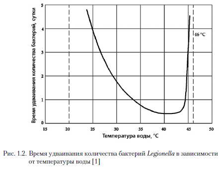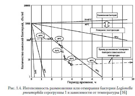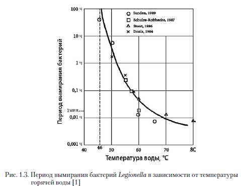 Характеристика бактерииПалочки бактерии Legionella имеют диаметр от 0,2 до 0,7 рм и длину от 2 до 6 рм, и могут пребывать как в естественной водной среде, так и в системах распределения воды. До сегодняшнего дня описано 42 вида бактерий Legionella (Legionellaceae), из которых выделено 64 серологические группы [8; 9]. Известно, что 17 видов может вызвать у человека заболевание. Самой грозной является бактерия Legionella pneumophila. Все виды Legionella являются потенциально патогенными для человека. Среди зарегистрированных заболеваний 80...90 % вызвано видом Legionella pneumophila серогруппы 1, а 10...20 % - это болезни, вызванные другими видами Legionella. Случаи заболевания отмечались во многих странах по всему миру [9], в том числе в Польше, что было подтверждено Санитарно-эпидемиологической службой. Ежегодно в Польше наблюдается 1000... 1300 заболеваний, среди которых летальный исход колеблется от 5 до 30 %, но реальное количество может быть даже десятикратно выше. В Германии регистрируют около 9000 случаев заболевания в течение года, а в США около 200 тыс. Бактерии Legionella являются естественной составляющей микрофлоры каждой воды и их можно встретить в том числе в питьевой воде, где наряду с этими бактериями находятся другие виды бактерий. Естественной средой для бактерий Legionella являются пресные поверхностные воды и грунтовые воды, особенно натуральные источники горячей воды, прибрежные зоны морской воды и почва. Количество этих бактерий в воде составляет 103...106 cfu/дм3 (cfu - единица, образовывающая колонию), а в благоприятных условиях может достигать даже 108 cfu/дм3. В естественных источниках горячей воды концентрация палочек колеблется от 102 до 106 cfu/дм3. Бактерии вида Legionella имеют огромную способность приспосабливаться к различным условиям окружающей среды. Возможно, что это влияет на патогенность бактерии Legionella. Способность возбуждать болезнь, вероятно, значительно меньше при температуре 24 °С чем при 37 °С. Способность палочки к размножению сохраняется при температуре от 15 °С до 46 °С. При температуре 46 °С размножение задерживается, а при 48 °С и выше - бактерии Legionella погибают [1]. Их оптимальное развитие происходит при температуре 37...43 °С. В естественной среде при более низкой температуре сильная конкуренция со стороны других микроорганизмов не позволяет им доминировать. Бактерии Legionella живут только в течение нескольких часов. Это значит, что даже если происходит размножение бактерии, за это время другие погибнут. Благодаря этому соблюдается равновесие. По сравнению с другими бактерии из группы Legionella размножаются медленно. Прирост количества бактерий, как и их уменьшение при определенной температуре, имеет экспоненциальный характер. С математической точки зрения такое течение событий можно описать с помощью следующих зависимостей: ![]() В случае размножения бактерий эти постоянные А и В положительны, а в случае их умирания постоянные отрицательны. Различие между массой и количеством бактерий объясняется тем, что, чтобы размножающиеся бактерии начали делиться, в начале должно произойти определенное увеличение их массы. Это означает небольшое запаздывание прироста количества бактерий по отношению к приросту их массы в начальной фазе размножения. Такое запаздывание не наблюдается при отмирании бактерий (постоянные А и В равны) [16]. Это означает, что, если будет определено время, после окончания которого 