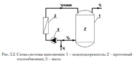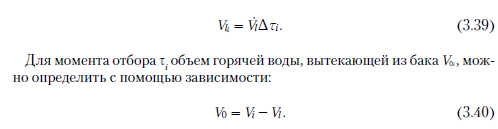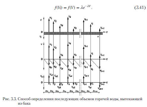 Определение неравномерности потребности в регулирующем объеме бака водоподогревателя в период определенной интенсивности потребления (ПОИП)В этой части будет определена связь между расходом наполнения и регулирующим объемом бака за период определенной интенсивности потребления в зависимости от вероятности появления потребности в этом объеме. Схема системы наполнения представлена на рис. 3.2. ![]() Переменная, определяющая расход воды, вытекающей из водоподогревателя - это разница двух параметров: расхода отбора и расхода подпитки. Считается, что подпитка происходит постоянно и что подпитывающий расход постоянен. Принимается также, что в этот период процесс открытия водоразборной арматуры можно описать с помощью процесса Пуассона с постоянной и известной интенсивностью. Распределение изменения отборов горячей воды при одном открытии водоразборного крана описывается как экспоненциальное распределение с известным параметром. Объем бака определяют для времени максимальной интенсивности отбора. Считается, что по отношению к отрезкам времени между моментами отбора воды длительность максимального отбора настолько велика, что в аналитических рассуждениях можно считать ее неограниченной. Такое решение возможно тогда, когда среднее поступление тепловой энергии или воды в бак больше среднего отбора. Эту проблему можно разрешить несколькими способами [5; 30; 31; 40]. Рассмотрим один из них - определение максимума случайного блуждания так называемым способом «ступенчатых точек» [30]. Работу системы подпитки можно представить в виде стохастического процесса, связанного со случайным блужданием. Для упрощения отборы V[ приписываются, как и ранее, определенным моментам. Рассматривается состояние, имеющее место в момент отбора. Количество поступающей между отборами воды из теплообменника в бак пропорционально разнице времени между последним и текущим отбором. Если промежуток времени между последним и происходящим отбором i обозначим Дт, то поступающей объем воды в это время составляет: ![]() Способ определения последующих объемов горячей воды, вытекающих из бака, представлен на рис. 3.3. Потребление горячей воды 14 и объем горячей воды Vu, подпитывающей бак в определенный момент, являются случайными переменными. Следует определить распределение случайной переменной 14, описывающей изменение объема воды, поступающего из бака, который является разницей этих случайных переменных. Случайную переменную 14, определяющую отбор горячей воды при одном открытии водоразборного крана, можно описать с помощью экспоненциального распределения, общего для всех отборов. Плотность распределения определяют зависимостью: ![]() Случайная переменная Voiy определяющая объем воды, подпитывающей бак, является произведением постоянного параметра (расхода подпитки) и случайной переменной Дт, соответствующей длительности времени между отборами. Случайная переменная Дт; обладает экспоненциальным распределением, что является результатом свойств процесса Пуассона с постоянной интенсивностью. Если случайную переменную с данным распределением умножить на постоянную величину, то вид распределения новой переменной такой же, как и старой [5]. Плотность распределения длительности между следующими моментами, приписанными отборам, определена как общая зави
