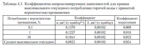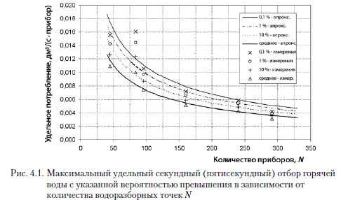 Определение секундного потребленияСекундное потребление зависит от количества водоразборных точек и вычисляется согласно следующей аппроксимирующей зависимости: ![]() На рис. 4.1. представлены показатели потребления отдельных объектов с принятой вероятностью превышения, а также кривые, отображающие расчеты, полученные из аппроксимирующих зависимостей, выведенных на основании проведенных исследований. ![]() Затем, принимая во внимание вышеуказанные подходы, произведен расчет коэффициентов для формул, характеризующих неравномерность секундного потребления с указанной вероятностью превышения. Зависимости с указанными коэффициентами можно использовать при проведении расчетов для зданий с количеством водоразборных точек от 40 до 300. Результаты расчетов представлены в табл. 4.1. ![]() Считаем, что формула с вероятностью превышения 1 % дает приведенным расчетам достаточную достоверность. Следовательно, расход воды для расчета теплового узла можно вычислить согласно следующей формуле: ![]() Полученные данные отличаются от данных согласно действующей норме PN-92/B01706 [2]. Это связано с другим подходом к проводимым расчетам, изменением в количестве потребляемой воды и с принятием другой вероятности превышения. При расчете расхода воды в жилом здании qM для проектирования системы водоснабжения необходимо использовать одну из формул, указанных в стандарте. Для многоквартирных жилых зданий данные формулы выглядят следующим образом: ![]() Шафлик В./Современные системы горячего водоснабжения. - К.: ДП ИПЦ «Taici справи», 2010. |