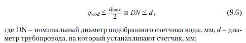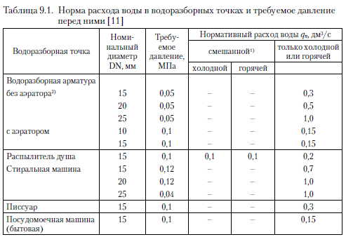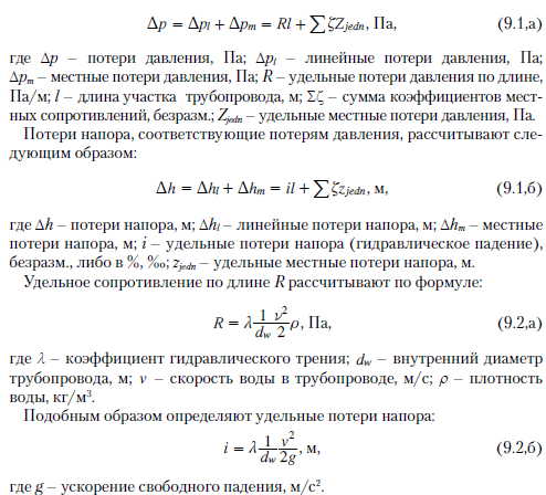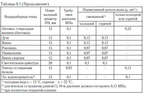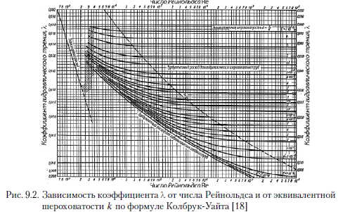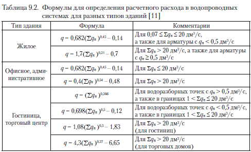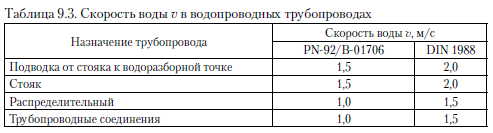 Подбор элементов распределения горячей водыОснованием подбора диаметров отдельных участков трубопроводов являются секундные расходы воды. Их определяют суммированием нормативных расходов воды санитарными приборами и бытовой техникой, вода к которым подается из данных участков. Нормативный расход воды в водоразборных точках и требуемое давление перед ними указано в табл. 9.1. ![]() ![]() Для определения расхода в системе ГВС при подборе диаметра подающего трубопровода используют в соответствии с нормой PN 92/В-01706 такие же зависимости как и для расчета трубопроводов холодной воды. Сравнение этих зависимостей, представленное в табл. 9.2, взято из нормы DIN 1988 [5]. ![]() Далее подбирают диаметры и проводят расчет потерь давления. Диаметры подбирают по номограммам или таблицам на основании принятой скорости воды в трубопроводах при расчетном расходе. Рекомендуемые скорости воды в трубопроводах представлены в табл. 9.3. ![]() Для определения необходимого давления в системе с подобранными диаметрами отдельно рассчитывают потери давления или потери напора на каждом участке. Расчет потерь давления на участке осуществляют по формуле: ![]() Для определения коэффициента гидравлического трения применяют формулу Колбрук-Уайта [18]: ![]() График зависимости коэффициента гидравлического трения от числа Рейнольдса и от эквивалентной шероховатости, определяемого по формуле Колбрук-Уайта, представлен на рис. 9.2. На практике удельные потери напора берут из таблиц или номограмм, точно так же, как значения коэффициентов ф необходимых для определения местных потерь. Удельные местные потери давления определяют по зависимости: ![]() При определении потерь давления точно определяют линейные потери напора. Местные потери для системы из стальных труб зачастую принимают равными 20...30 % от линейных потерь. В работе [3] сказано, что в системах из полимерных материалов местные потери составляют 100... 150 % от линейных потерь. ![]() Важным этапом проектирования системы является подбор счетчика воды. Счетчик воды подбирают в соответствии с нормой PN-92/B-01706. Выбор роторного счетчика воды осуществляют по следующему принципу: а) определяют расчетный расход для здания или его части, для которой будет рассчитано потребление воды q б) определяют условный расчетный расход для счетчика qwod. ![]() в) счетчик подбирают таким образом, чтобы условный расчетный расход qwod был меньше максимального объемного расхода qm3X, указанного производителем счетчика; г) подбор счетчика считается правильным при соблюдении условия: ![]() д) для подобранного счетчика определяют, основываясь на данных производителя счетчика, потери давления при расчетном расходе воды q через счетчик. Подбор какого-либо средства измерения объема, объемного или массового расхода, кроме роторного счетчика, следует осуществлять в соответствии с рекомендациями производителя измерительного устройства. Потери напора на счетчике Дhwod определяют по формуле: ![]() Потери давления на счетчике определяют зависимостью: ![]() Требуемое минимальное давление воды pmin в месте, для которого определяют располагаемое давление для системы, рассчитывают по формуле: ![]() При проектировании системы следует сравнить требуемое минимальное давление воды для системы с располагаемым давлением в подающем трубопроводе. Для системы, расположенной в зоне де