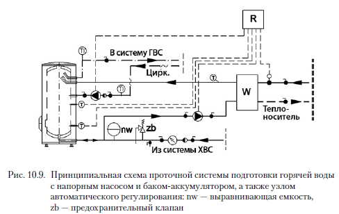 Проточные водоподогреватели с бакомПроточную систему с напорным насосом и баком-аккумулятором используют уже долгое время [2; 5]. Подача воды к водоразборной точке осуществляется через арматуру, подключенную к баку трубопроводами системы ГВС. Бак-аккумулятор подключен с напорной стороны, где установлен подогревающий воду теплообменник и насос. Насос всасывает воду из нижней части бака и подает ее в теплообменник, в котором вода подогревается до соответствующей температуры, а затем поступает в верхнюю часть бака. Принципиальная схема такой системы представлена на рис. 10.8. ![]() Если разбор воды превышает подачу насоса, вода из бака постепенно убывает. А если находится на том же уровне, то весь водоразборный расход проходит через теплообменник, минуя при этом бак (V,). Бак-аккумулятор в данном случае находится в равновесном состоянии. Если расход воды меньше, чем подаваемый насосом расход воды (Vi > Vi), то происходит наполнение бака. В прошлом такие системы применяли в крупных узлах подготовки горячей воды. В системах с запиткой от котла центрального отопления в односемейных домах первоначально применяли нагревающую спираль в баке-аккумуляторе или наружный нагревающий пояс (рубашку), подключенные к котлу. В настоящее время, благодаря развитию технологии производства и наличию на отопительном рынке компактных теплообменников, начали использовать проточную систему с насосом и баком- аккумулятором. Схема такой системы с узлом автоматического регулирования представлена на рис. 10.9. ![]() Шафлик В./Современные системы горячего водоснабжения. - К.: ДП ИПЦ «Taici справи», 2010. |