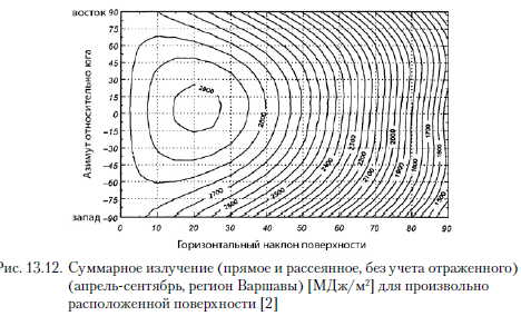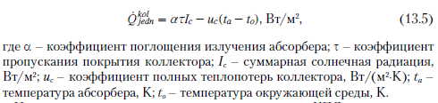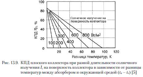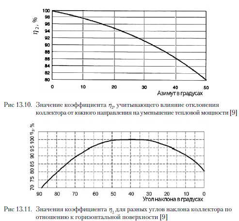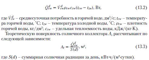 Расчет контура подогрева водыПроизводители элементов системы в разработанных нормах проектирования [3] принимают, что в схеме приготовления горячей воды с помощью солнечного коллектора горячая вода подогревается до 45...50 °С. Это является результатом значительного снижения КПД коллекторов при более высоких температурах. К тому же в прямых схемах усиливается выпадение накипи в системе и усиливается коррозия, в свою очередь в промежуточных контурах может наблюдаться перегрев и испарение теплоносителя, что может привести к завоздушиванию и снижению КПД коллекторов. Такая ситуация вероятна и при водоразборе, меньше принятого по отношению к размеру солнечного коллектора. Тогда подогрев воды уменьшится, по сравнению с запроектированным. Подбор коллекторов основан на предположении, что в летний период они должны обеспечивать 100 % энергии, необходимой для подогрева воды до 45 °С в количестве, соответствующем суточному потреблению воды. Для польских условий в летний период на 100 дм3 суточного водоразбора принимают от 1,5 до 3 м2 поверхности плоских коллекторов и от 1,2 до 1,6 м2 вакуумных коллекторов. Увеличение поверхности коллекторов позволяет достичь более высокой температуры подогреваемой воды при одновременном снижении их КПД. Для Польши поверхность коллекторов свыше 3,5 м2 на 100 дм3 суточного разбора горячей воды нежелательна с экономической точки зрения. В то же время снижение поверхности коллекторов ниже 1,5 м2 приводит к тому, что слишком малая доля солнечной энергии участвует в процессе приготовления горячей воды. Объем бака горячей воды определяют на основании среднесуточного разбора горячей воды. Для средней системы с солнечными коллекторами при значительном колебании водоразбора рекомендуется, чтобы объем бака составлял 1,5 суточного объема разбора горячей воды. Для системы частного дома следует принимать значение этого показателя на уровне двух. Однако в больших объектах объем бака-аккумулятора следует определять на основании графических зависимостей, характеризующих изменение во времени количества теплоты, поставляемой от коллекторов и потребляемой с горячей водой. Предлагаемые на рынке баки ГВС имеют теплообменники с поверхностью от 0,6 до 1,2 м2 поверхности теплообмена на 100 дм3 объема. Теплообменники могут быть кожухотрубные или трубные из медных труб (18 или 22 мм) или из нержавеющих труб (3/4 или 1). Вначале необходимо рассчитать среднесуточную потребность в горячей воде. Ее определяют по следующей зависимости: ![]() Далее следует определить среднесуточную потребность в солнечной энергии, необходимой для приготовления горячей воды Qcw. ![]() Действительную поверхность солнечного коллектора рассчитывают с учетом КПД коллектора, а также угла отклонения от южного направления и угла наклона коллектора по отношению к горизонтальной плоскости: ![]() КПД коллектора определяют исходя из полезной плотности теплового потока Qjedn по уравнению баланса энергии HWB (Hottel - Whillier - Bliss) [5]. Плотность теплового потока QjeL определяют по формуле: Qjedn = ат1с - lie(Та ~ То), Вт/м2, ![]() Исходя из представленной зависимости, тепловой КПД коллектора определяется по уравнению: ![]() ![]() Временный КПД коллектора 771 может составлять 60...70 %, в то же время средний сезонный КПД в умеренном климате составляет около 40 % [5]. Плоскость солнечного коллектора по мере возм