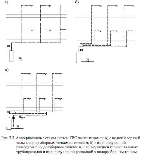 Система горячего водоснабжения частного домаЦентральная система ГВС одно- либо двухсемейного дома в особых случаях может быть выполнена без циркуляции. Разводка трубопроводов ГВС может быть выполнена по схеме, представленной на рис. 7.5,а, классическим способом в общей системе или согласно рис. 7.5,6 - индивидуально, когда к каждой водоразборной точке от нагревателя проложен отдельный трубопровод. В обоих случаях можно отказаться от циркуляции либо от дополнительного обогрева трубопроводов электрическим кабелем при наличии коротких участков трубопроводов. ![]() Решение об отсутствии циркуляции необходимо принимать, учитывая время подачи горячей воды, и, по возможности, на основании расчета потерь воды при ее сливе или потерь тепловой энергии. Допустимая длина трубопровода без циркуляции или дополнительного подогрева, которую необходимо учитывать, представлена в табл. 7.1 и 7.2 [4]. Если водоподо- греватель расположен на одном этаже с водоразборными точками, то, как правило, систему выполняют без циркуляции. Система может быть запроектирована с классической циркуляцией (рис. 7.3), либо только с циркуляцией горизонтальных ветвей (рис. 7.4), либо с циркуляцией в горизонтальных ветвях, расположенных под перекрытием подвала и первого этажа, с отдельной разводкой трубопроводов горячей воды к каждой водоразборной точке (рис. 7.5,в). Циркуляцию системы ГВС частного дома можно выключать в ночное время (например, с 23.00 вечера до 06.00 утра следующего дня). Анализ эксплуатационных затрат системы ГВС частных жилых зданий представлен в работах [3; 11 ]. Расчеты, приведенные в работе [ 11 ], показывают, что дополнительные затраты зависят от технического решения выполнения системы, и в зданиях с двумя стояками на 50 % превышают затраты для зданий с одним стояком. В частных домах дешевле эксплуатировать систему ГВС без циркуляции: экономия около 29 злотых ежемесячно в сравнении с круглосуточно циркулирующей системой и около 20 злотых при отключении циркуляции в ночные часы (г. Щецин, по ценам в январе 2008 г.). Шафлик В./Современные системы горячего водоснабжения. - К.: ДП ИПЦ «Taici справи», 2010. |