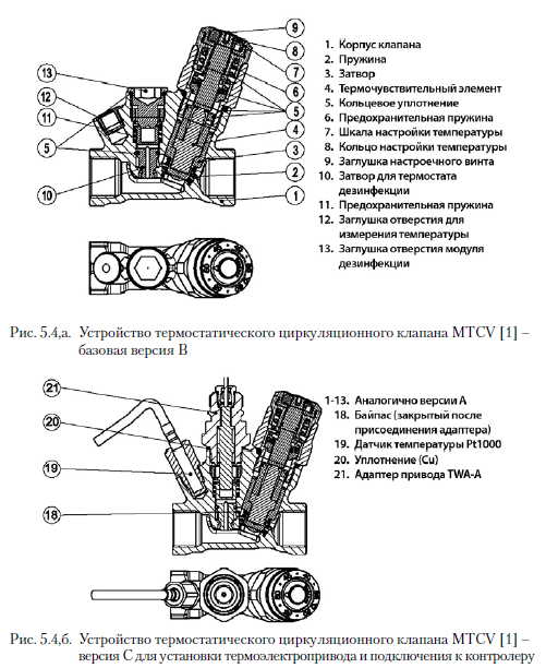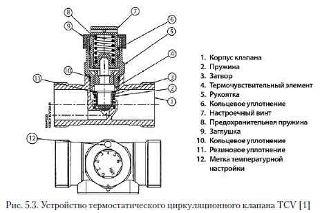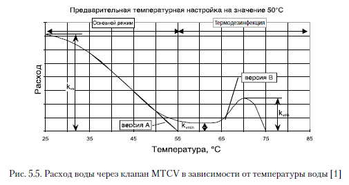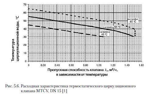 Термостатические циркуляционные клапаныОсновной арматурой для балансировки циркуляционных систем ГВС являются термостатические циркуляционные клапаны. Принцип работы этих балансировочных клапанов рассмотрим на примере клапанов первой серии компании «Данфосс» - TCV [1]. Он аналогичен принципу работы радиаторного термостатического клапана с той лишь разницей, что термостатический датчик размещен внутри клапана и реагирует на температуру воды, а не воздуха. Температура проходящей воды оказывает непосредственное воздействие на термоэлемент, находящийся в потоке воды. Если температура проходящей воды увеличивается, то термоэлемент удлиняется и перемещает затвор клапана в сторону седла, уменьшая расход. При снижении температуры термочувствительный элемент укорачивается, и затвор клапана перемещается от седла. Сопротивление клапана при этом уменьшается, что приводит к увеличению расхода воды, проходящей через клапан. Чаще всего в качестве термочувствительного вещества в термоэлементе используют парафин, что связано с высокой тепловой инерцией данного материала. Винт настройки регулирует перемещение термостатического элемента по отношению к корпусу клапана. Закручивание настроечного винта приводит к снижению температуры, при которой происходит закрытие клапана. Конструкция описанного выше термостатического циркуляционного клапана представлена на рис. 5.3 [1]. ![]() Конструкции современных термостатических клапанов MTCV компании «Данфосс» изображены на рис. 5.4. Клапан MTCV выпускают в трех версиях: версия А - базовая, действует аналогично клапану TCV; версия В, оснащенная дополнительным термостатическим клапаном, который открывается при температуре воды выше 65 °С, позволяя осуществлять термическую дезинфекцию системы; версия С оборудована термоэлектроприводом, управляемым специальным контролером. В версии С можно настраивать параметры термической дезинфекции, т. е. период, продолжительность и, если необходимо, последовательность дезинфекции стояков непосредственно на контролере. ![]() ![]() Для описания пропускной способности kv термостатического циркуляционного клапана в зависимости от температуры прибегают к линейной характеристике. Компания «Данфосс» [1] разработала график для термостатических циркуляционных клапанов системы ГВС, на котором пропускная способность kv представлена в зависимости от заданной настройки и температуры воды. На рис. 5.6 показано, как kv изменяется в зависимости от температуры. Данный график приведен для клапана MTCV. ![]() Шафлик В./Современные системы горячего водоснабжения. - К.: ДП ИПЦ «Taici справи», 2010. |