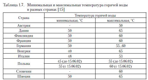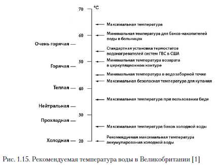 Требования к горячей волеГорячая вода с точки зрения физико-химических и санитарных свойств должна соответствовать требованиям распоряжения Министерства здравоохранения от 29 марта 2007 года относительно качества воды, предназначенной для использования людьми [3]. В случае горячей воды, применяемой для технологических процессов, требования к физико-химическим свойствам определяются технологическими процессами. Вода, предназначенная для питья, не является химически чистой, она содержит растворенные соли и газы. В среднем в питьевой воде содержится 0,2...0,5 г соли на дм3. Эти соли можно разделить на две группы: соли, приводящие к жесткости воды: в основном Са(НСОэ)2 гидрокарбонат кальция, Mg(HC03)2 гидрокарбонат магния и другие соли кальция и магния и нейтральные соли, например, гидрокарбонат натрия NaHC03, хлорид натрия NaCl, сульфат натрия Na2S04 и другие. Среди растворенных газов самыми важными являются кислород 02 и оксид углерода. Содержание соли и растворенных газов влияет на поведение воды при более высокой температуре, особенно на выпадение накипи и на коррозионные свойства воды. Пособия по проектированию представляют общепринятую практику и стремятся к экономически обоснованным и практическим решениям. Рекомендуемая температура воды в Великобритании в зависимости от назначения ее применения и в различных элементах системы показана на рис. 1.15 [1]. ![]() Выбор температуры аккумулируемой горячей воды определяется оптимумом между экономической выгодой от применения меньшего бака при более высокой температуре, увеличением риска ожогов и увеличением каменного осадка или коррозии. Пятьдесят лет назад рекомендуемая британскими нормами температура аккумулируемой воды (для мягкой воды) составляла 71 °С (1954). Позже - 65 °С (1970). В последнее время, особенно для больниц, - 60°С (1990). Специалисты из Великобритании считают, что 60 °С - это максимальная температура аккумулируемой воды для обычных условий (1988). Принятая температура горячей воды в отдельных странах показана в табл. 1.7. ![]() Считается, что температура может понизиться приблизительно на 2 °С в баке-аккумуляторе при каждом его наполнении. Также небольшое падение температуры может произойти в больших циркуляционных контурах (5...10 °С). Более значительное падение температуры может произойти при разбрызгивании воды из душа. Поэтому минимальная рекомендуемая температура циркуляционной обратной воды должна составлять свыше 50 °С. В соответствии с данными CIBSE (Институт инженеров по обслуживанию зданий, Великобритания) (1987) требуется, чтобы минимальная температура горячей воды, поступающей из водоразборной арматуры составляла 46 °С, в то время, как британское Министерство здравоохранения в целях защиты здоровья людей обязывает информировать соответствующие власти в случае падения температуры горячей воды в водоразборных точках ниже 45 ° С. В особых случаях в детских отделениях больниц или в гериотрических отделениях, там, где пациенты могут остаться без наблюдения, горячая и холодная вода смешивается в термостатических смесителях и ее максимальная температура должна быть ниже 43 °С. Максимальная температура воды для биде составляет 37 °С. ASHRAE (1987) (Американское сообщество по отоплению, охлаждению и кондиционированию) советует временно направлять поток воды с температурой 77 °С в водоразборные 