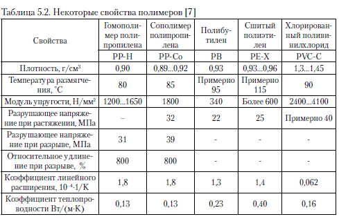 Трубы из полимерных материаловВ системах ГВС используют, в основном, термопластические термовиниловые материалы (плотностью 1,3... 1,45 г/см3) и полиолефины (плотностью 0,89...0,96 г/см3) [7]. В таких системах среди поливиниловых материалов предпочтение отдается хлорированному поливинилхлориду (CPVC), а среди полиолефинов - сшитому полиэтилену высокой плотности (РЕ-Х), полибутилену (РВ) и полипропилену (РР). Рядом с наименованием пластика указывают принятую маркировку. В практике можно встретить и другие обозначения, являющиеся чаще всего фирменной маркировкой, которые не следует путать с названиями отдельных материалов. Технические характеристики поливиниловых материалов зависят от процесса производства. В процессе изготовления происходит перемешивание, а затем термоформовка в четко указанных условиях (включая, давление, температуру и продолжительность процесса). Даже малейшее отклонение от «рецептуры» производства может привести к изменению характеристик готового изделия. Продукты из полиолефинов изготавливают из полуфабриката - гранулята, производимого на химических предприятиях. Характеристики конечного продукта зависят, прежде всего, от используемого сырья. Другие пластические материалы использует редко. Это связано со специальными, предъявляемыми к этим материалам требованиями либо же с их ограниченным количеством. Условия применения таких материалов четко определены производителем. В монтажных изделиях (часто в одном изделии) можно наблюдать соединение различных видов полимеров и других материалов - металлических вкладок, ленты и пр. Например, в многослойных трубах с целью обеспечения диффузионной непроницаемости кислорода и ограничения теплового линейного удлинения, внутренний слой изготавливают из алюминия. В монтажных изделиях практически не используют полимеры в чистой форме (гомополимеры). В их состав всегда входят другие различные компоненты, такие как краситель или добавки, модифицирующие свойства полимеров, увеличивающие прочность, упругость, устойчивость к термическому износу и др. Именно поэтому полимерные материалы различных производителей, имеющие идентичное название, могут отличаться по своим свойствам. Для определения свойств материала крайне важно ознакомиться с фирменной маркировкой и информацией производителя. Принято считать, что прочность труб и арматуры из полимерных материалов при температуре 20 °С составляет 50 лет. Однако необходимо помнить, что при увеличении рабочей температуры, прочность материала уменьшается. Химическая стойкость зависит как от вида вещества, так и от его концентрации и температуры. В таблицах химической стойкости производителей представлена стойкость материала труб согласно различным критериям. Все виды полимеров характеризуются стойкостью к воде. В табл. 5.2. представлены некоторые свойства полимеров, применяемых в системах ГВС. ![]() Система может быть собрана из отдельных элементов или из элементов, составляющих определенную инженерную конструкцию. Если во время сборки системы используют общедоступные элементы, выполненные по общепринятым стандартам и нормам (например, трубы и раструбные фасонные детали, резьбовые соединения), то такие элементы не являются сложной инженерной конструкцией и могут быть соединены в любой последовательности, при услов