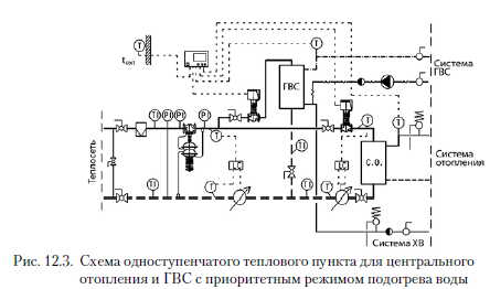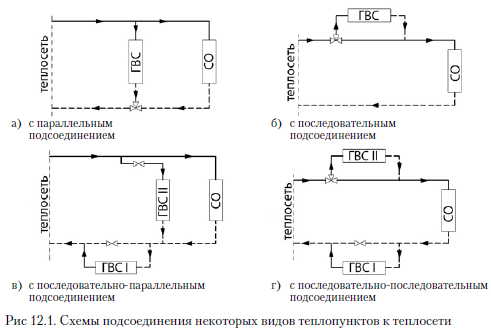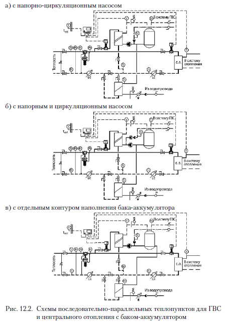ВведениеЦентрализованная подготовка горячей воды предназначена для снабжения водой большого количества потребителей. В зависимости от системы ГВС выделяют два основных вида централизованных систем: - полностью проточные системы; - системы, аккумулирующие подогретую воду. Накапливающие подогретую воду системы можно, в свою очередь, разделить на: - системы с емкостным водоподогревателем; - системы с проточным водоподогревателем и баком-аккумулятором горячей воды. По используемому теплоносителю системы ГВС с централизованной ее подготовкой практически не отличаются от местной подготовки. Узлы подогрева воды, подключенные к теплосети, получили название тепловых пунктов ГВС. Работа теплопункта горячего водоснабжения чаще всего скоординирована и связана с работой теплопункта центрального отопления. Теплопункты, обеспечивающие водой жителей одного здания, называют индивидуальными, а несколько зданий - центральными. В теплопунктах ГВС, запитанных от теплосети, выделяют несколько вариантов подачи теплоносителя в зависимости от способа взаимодействия потребителя с теплосетью. С точки зрения подключения теплопункта центрального отопления к теплосети выделяют: 1) одноступенчатые теплопункты: - последовательные; - параллельные; 2) двухступенчатые теплопункты: - последовательно-параллельные; - последовательно-последовательные. Название перечисленных выше видов теплопунктов связано со способом подключения теплообменника (водоподогревателя) ГВС к теплопункту центрального отопления: последовательно или параллельно. В названии двухступенчатого теплопункта первый термин характеризует способ подключения теплообменника системы ГВС I ступени (предварительный нагрев). Схемы подключения к теплосети представлены на рис. 12.1. Двухступенчатые теплопункты применяли с целью наиболее оптимального использования теплоносителя, что достигалось путем снижения температуры воды, возвращающейся к источнику теплоты. Снижение температуры имеет большое значение при подключении к теплоэлектроцентрали. Поддержание низкой температуры теплоносителя в обратной магистрали обеспечивает экономичную работу источника теплоты. Для подогрева воды можно применить любой из представленных на рис. 12.1 способов подключения теплообменников к теплосети. Первоначально в системах теплоснабжения использовали схемы подогрева воды с емкостными водоподогревателями. Среди преимуществ емкостных водоподогревателей выделяют возможность уменьшения пикового расхода горячей воды благодаря баку-аккумулятору, возможность быстрого снабжения значительного количества воды, а также простоту регулирования температуры воды. В таких водоподогревателях происходила быстрая коррозия баков и нагревающих спиралей, которые из-за низкой тепловой мощности были очень большими, а значит их эффективный объем (по отношению к общему объему бака) был небольшой. На спиралях и в баках-аккумуляторах образовывалась накипь. Именно поэтому в конце пятидесятых годов прошлого столетия широкое применение нашли системы с отдельным баком- аккумулятором и теплообменником, а также напорным насосом [ 1; 6]. ![]() На рис. 12.2 представлены три варианта теплопункта для ГВС и центрального отопления с последовательно-параллельным подсоединением и с баком-аккумулятором: с напорно-циркуляц