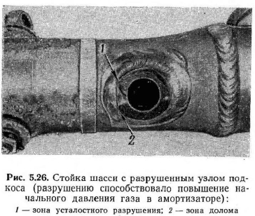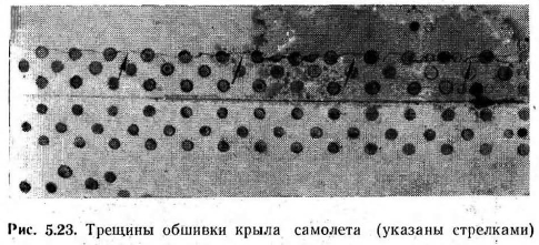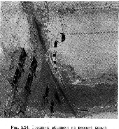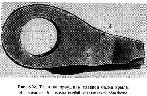 ИССЛЕДОВАНИЕ НЕИСПРАВНОСТЕЙ ОСНОВНЫХ СИСТЕМ И УСТРОЙСТВ САМОЛЕТОВ И ВЕРТОЛЕТОВАгрегаты планера Планер самолета включает в себя фюзеляж, крыло, оперение и шасси. В нем размещены кабины для экипажа и пассажиров, системы и оборудование. Ввиду того что планер служит для создания аэродинамических сил, позволяющих осуществлять полет, он подвержен действию больших знакопеременных нагрузок. Планер состоит из силовых элементов, соединенных и общую силовую схему, и из несиловых элементов при помощи первых воспринимаются нагрузки в полете и на земле, при помощи вторых создаются нужные аэродинамические формы самолета или вертолета. Кроме того, песиловые элементы воспринимают и передают распределенную нагрузку на силовые элементы. Исходя из сказанного, можно сделать вывод, что как на силовых, так и на несиловых элементах планера вследствие большего или меньшего их нагружения могут появляться неисправности. На деталях планера (балках, угольниках, фитингах, обшивке) могут возникнуть трещины, а также срез и ослабление заклепок, местная потеря устойчивости обшивки (хлопуны) и т. д.; Наиболее опасно возникновение усталостных трещин па силовых деталях планера. Следует иметь в виду, что детали планера, выполненные из высокопрочных сталей типа хромансиль, особенно расположены к возникновению усталостных трещин, что объясняется очень большой чувствительностью их к концентраторам напряжений. Поэтому незначительная, на первый взгляд,, забоина со временем может стать источником появления трещины либо поломки. При производстве деталей из материалов, чувствительных к концентраторам напряжений, особое внимание уделяется чистоте обработки поверхностей главным образом в местах переходов, галтелях и шпоночных канавках. При проектировании силовых узлов конструкторы учитывают условия работы этих узлов и свойства материалов, применяемых для их изготовления. В технической эксплуатации при проведении всевозможных осмотров и выполнении регламентных работ технический состав должен тщательно выполнять предписания технических документов, регламентирующих эти осмотры и работы. Узлы, детали и отдельные места, на которых возможно появление трещин, как правило, осматриваются при помощи луп различного увеличения. При подозрении на возникновение трещины данное мес- то проверяют одним из существующих методов дефектоскопии (магнитным, ультразвуковым, методом красок или др.). При осмотре крыла обращают внимание на узлы его крепления к фюзеляжу, основные соединения, элементы конструкции, воспринимающие вертикальный изгибающий момент, на крепление к нему двигателя и на узлы крепления к нему шасси. При этом учитывают особенности силовой схемы крыла. ![]() Разрушению крыла лонжеронной схемы от повторных нагрузок предшествуют трещины главной балки (рис. 5.22) или лонжерона крыла. Испытания на повторные нагрузки самолетов с крыльями лонжеронной схемы и опыт технической эксплуатации и ремонта показывают, что задолго до разрушения конструкции появляются неисправности несиловых элементов— трещины обшивки, заершенность заклепок (рис. 5.23)—и только после этого появляются трещины и разрушения силовых деталей конструкции. Между начальными повреждениями -и окончательным разрушением крыла Прикладывается довольно большое количество нагружений. Следоват