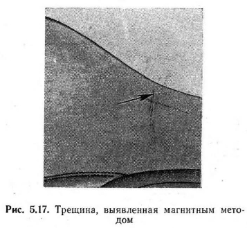 МЕТОДИКА ИЗУЧЕНИЯ НЕИСПРАВНОСТЕЙ И ПРОВЕДЕНИЯ ИХ ИССЛЕДОВАНИЯАнализ внешнего состояния Этот этап исследования является очень важным и, несмотря на свою кажущуюся простоту, требует от исследователя большого внимания, терпения, глубокого знания конструкции и всех особенностей работы исследуемой авиационной техники. При проведении анализа внешнего состояния знакомятся с обстоятельствами отказа: где отказ произошел, на земле или в воздухе, — и изучают взаимное расположение деталей. Изучение самой отказавшей детали (агрегата) начинают прежде всего с ее внешнего осмотра. При этом определяют, есть ли изломы, трещины, следы ударов, царапины и другие внешние повреждения, а также деформации детали. При обнаружении неисправностей их рассматривают в том состоянии, в каком они были обнаружены после извлечения детали из узла или агрегата. Если на поверхность излома попало масло или грязь, ее следует аккуратно промыть чистым бензином Б-70 или спиртом с применением волосяной щетки. Продукты коррозии с поверхности излома удаляют обработкой 1—2%-ным водным раствором соляной кислоты (для стальных деталей) или слабым раствором щелочи (для алюминиевых деталей). Осмотр отказавшей детали для установления внешних повреждений производится вначале невооруженным глазом. Минимальный размер дефекта, который может быть обнаружен при визуальном контроле, зависит от характера исследуемой поверхности, уровня яркости и контраста яркостей между деталью и фоном. Глаз достаточно быстро утомляется и острота зрения снижается, поэтому визуальный осмотр является недостаточно точным методом исследования. Ограниченность остроты человеческого зрения компенсируется применением раз- личного рода оптических устройств, таких, как зеркала, лупы, трубоскопы, микроскопы и др. Одним из наиболее простых способов контроля недоступных или скрытых поверхностей является осмотр их при помощи зеркал. Зеркальные поверхности должны быть совершенно плоскими и чистыми, так как лишь при этом условии обеспечивается хорошая четкость изображения. При использовании нечетного числа зеркал (в частности, одного) получается «зеркальное» изображение реальной картины. Это обстоятельство всегда следует иметь в виду. Лупа представляет собой единичную собирательную линзу. Увеличение г, которое обеспечивает лупа, определяется следующим выражением: ![]() Пользуясь этой формулой, можно рассчитать, что линза с фокусным расстоянием 12,5 см даст двукратное увеличение. Фокусное расстояние простой лупы и ее рабочее расстояние приблизительно одинаковы. Если, например, необходимо осмотреть поверхность детали, расположенную таким образом, что лупа не может быть поднесена к ней ближе чем на 7,5 см} то необходимо использовать лупу с рабочим расстоянием около 7,5 см. В соответствии с приведенным выше уравнением необходимо применить лупу с трехкратным увеличением. При исследовании больших поверхностей сначала используют лупу с небольшим увеличением и выявляют г подозрительные места, а затем с большим увеличением. Чтобы максимально использовать возможность лупы, ее всегда следует держать как можно ближе к глазу, так как при этом глаз воспринимает наибольшее количество лучей, а плоскость линзы располагать параллельно плоскости исследуемого объекта. При необходимости поврежденные места, 