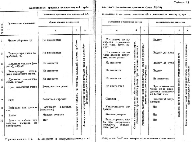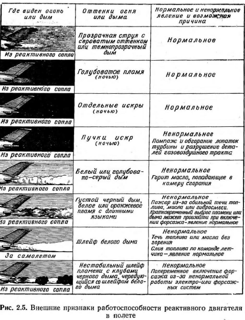 ОПРЕДЕЛЕНИЕ РАБОТОСПОСОБНОСТИ ДВИГАТЕЛЯ. ХАРАКТЕРНЫЕ НЕИСПРАВНОСТИРеактивный двигатель летательного аппарата представляет собой сложную машину и от его надежной работы во многом зависит успех полета, выполнение задания и даже жизнь экипажа и пассажиров. Работоспособность силовой установки с его агрегатами в целом должна проверяться так, чтобы все неисправности, в том числе и скрытые, не остались невыявленными при осмотре и опробовании двигателя на земле. Если экипаж хорошо изучил двигатель, то внезапно появившиеся в воздухе отказы он сможет распознать без особых затруднений. Зная характер отказа, можно принять правильное решение и предпринять действия, исключающие тяжелые последствия. Прежде всего надо знать место отказа, т. е. что отказало, и затем установить по приборам или другим признакам — почему отказало. Ниже приводится несколько способов контроля работоспособности двигателя: — по показаниям приборов (тахометру, термометру, манометру и др.); это так называемый инструментальный контроль; — по звуку (хлопкам, бубнению, скрипу, скрежету и др.); — по цвету выхлопных газов; — по вибрациям, дрожанию, «зуду» и др. (по колебаниям); — по выбегу двигателя; — по запаху газов. Большинство неисправностей и отказов можно определить по их внешним признакам (по звуку, цвету и запаху газов, вибрациям и выбегу) или инструментальным контролем (по показаниям приборов). Например, о возникновении помпажа в реактивном двигателе можно судить по резкому изменению шума, т. е. по периодическому появлению хлопков, толчков и ударов, свидетельствующих о том, что происходит характерный для помпажа выброс воздуха в воздухозаборник. При пом- паже растет температура обороты и тага двигателя. Падение тяги двигателя нетрудно заметить по поведению самолета. Могут возникнуть колебания по курсу, крену и тангажу. При длительном помпаже обгорают лопатки турбины, нарушается балансировка ротора, разрушается газовоздушный тракт двигателя. Все это сопровождается выбрасыванием из реактивной трубы черного дыма с длинными языками пламени и пучков искр, особенно хорошо видимых ночью. Вследствие этого на створках форсажной трубы и в самом канале образуется капельный блестящий металлический налет, называемый шоопированием. Следовательно, помпаж можно определить по приборам контроля работы двигателей, по звуку и по окраске выхлопных газов. Контроль работы двигателя по показаниям приборов — наиболее достоверный и точный способ, позволяющий оценить исправность большинства технических устройств и деталей двигателя. Так, по указателю оборотов (тахометру) можно судить о тяге двигателя, его выключении, скорости самолета, разрушении подшипника ротора, нормальном тепловом обмене, происходящем в двигателе, и о многих других явлениях. Для удобства отсчета показаний в последнее время стали применять тахометры с процентной шкалой, где 100% соответствует максимальному, 96% номинальному и 90% крейсерскому (эксплуатационному) режимам двигателя. Тепловые режимы оценивают по указателям температуры (электротермометрам). Термоэлектрические термометры, где датчиками служат термопары, измеряют температуру газов за турбиной. Электротермометры сопротивления измеряют температуру выходящего из двигателя масла. По температуре газов за турбиной судят о процессе сгорания 