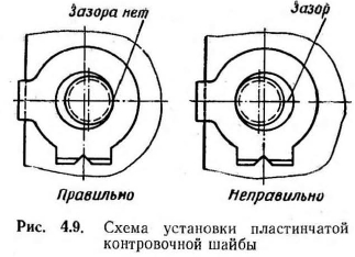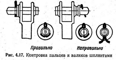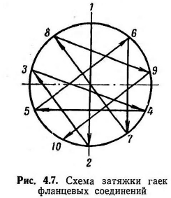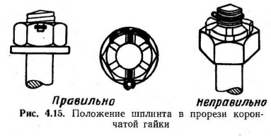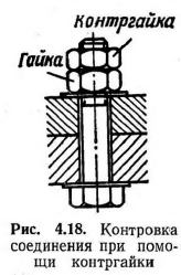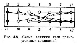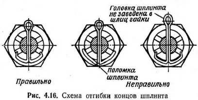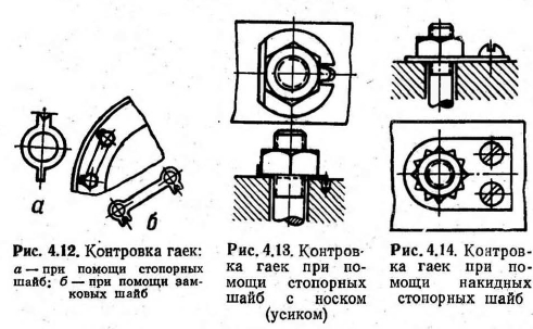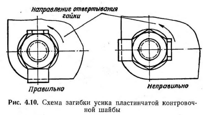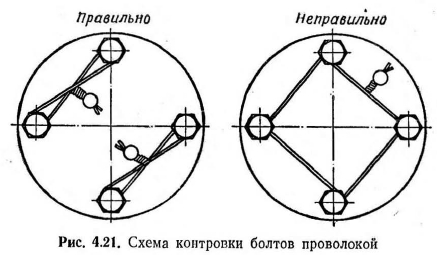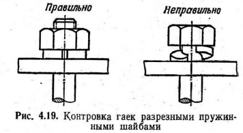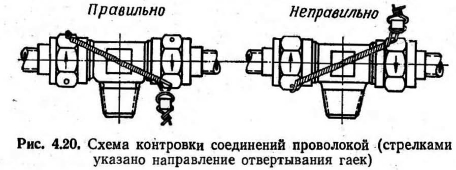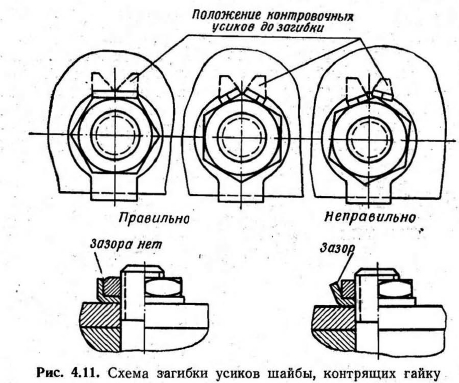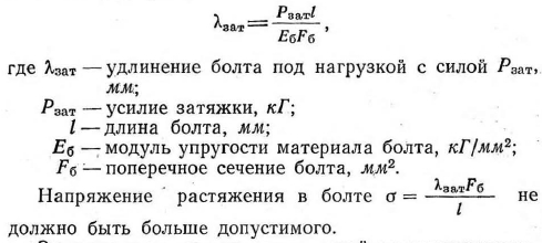 ОСОБЕННОСТИ МОНТАЖА РЕЗЬБОВЫХ СОЕДИНЕНИЙ И ИХ КОНТРОВКАОсновными деталями резьбовых соединений являются болты, винты, шпильки, гайки и стопорные устройства, предохраняющие разъемы от самоотвинчивания. Для правильной сборки резьбовых соединений необходимы полная затяжка винтов и гаек, достижение нужной посадки сочленяемых деталей без перекосов, искривлений и предупреждение их от самоотвинчивания. В тех случаях, когда в соединяемых деталях требуется герметичность, монтаж производится с использованием соответствующих деформирующихся прокладок. Ниже рассматривается последовательность выполнения этих работ. При навертывании гаек обращают внимание на то, чтобы они шли свободно (от руки) до места посадки и в то же время не имели качки на болте или шпильке, что является признаком неплотного прилегания витков. При тугой посадке можно сорвать резьбу и замять грани гайки, в результате чего она будет прокручиваться и не получится достаточно плотного соединения монтируемых деталей. При этом возникающие добавочные силы трения создадут ложное представление о достаточности затяжки, а на самом деле она может оказаться слабой и резьбовое соединение разрушится. Тугая посадка указывает на такие дефекты, как рваная, косая или неполная резьба, наличие заусенцев, забитость резьбы грязью или стружкой, смятие витков резьбы, и коррозию. Торец гайки должен быть перпендикулярен к оси болта или шпильки и не иметь шероховатостей или забоин. В противном случае появится дополнительное трение. Прилегание торца под углом вызовет изгиб нарезной части болта или шпильки, и даже может произойти надлом стержня. Если при завертывании гайки торец гайки описывает «восьмерку» или имеется однобокий зазор, то оси гайки и болта не параллельны. , Правила монтажа резьбовых соединений Первое правило. Гайки до места посадки следует навертывать усилием руки. Не допускаются к эксплуатации гайки с качкой и надирами на торце. Неравномерная или чрезмерная затяжка отдельных гаек крепления какой-либо детали увеличивает нагрузку на шпильку или на стяжной болт и может привести к деформации резьбы и обрыву шпильки. Поэтому затягивать гайки, особенно герметичных соединений, надо равномерно, с определенным усилием. Обычно эту работу выполняют при помощи предварительно проверенных тарированных ключей. Контролировать затяжку можно и по величине удлинения болта или по повороту ключа на расчетный угол. Тарированные ключи устроены так, что при достижении заданной силы затяжки гаек они автоматически выключаются. Усилие затяжки можно определить, если удлинение болта измерять микрометром. Этим способом чаще пользуются при монтаже силовых стяжных болтов. Зависимость удлинения болта от силы затяжки находится по формуле ![]() Затяжка гаек выполняется в такой последовательности: вначале гайки затягиваются предварительно на определенный угол с целью создания плотного соединения в стыках собираемого узла (т. е. выбирают все зазоры), затем гайки отвертываются и вновь навертываются до соприкосновения с шайбами или деталью. После этого гайки затягиваются постепенно и равномерно сначала на Уз затяжки (или расчетного угла поворота), затем все гайки на 2/3 затяжки и, наконец, все гайки на полную затяжку (или полный расчетный угол поворота). Полная затяжка вначале одной гайки, за