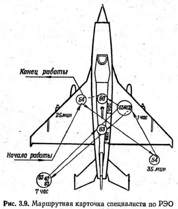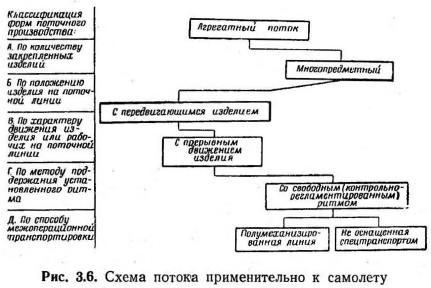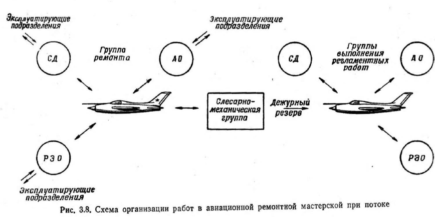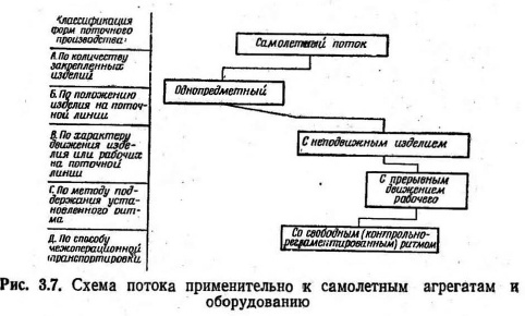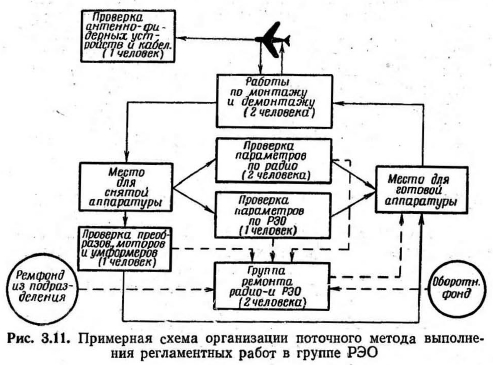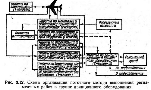 ПОТОЧНЫЙ МЕТОД ВЫПОЛНЕНИЯ РЕГЛАМЕНТНЫХ РАБОТУвеличение налета на каждого летчика ведет к увеличению объема работ в авиационной ремонтной мастерской. Опыт показал, что в данных условиях наиболее эффективным методом выполнения регламентных работ является поточный метод. Поточный метод и анализ применимости его в авиационной ремонтной мастерской. Для поточного метода характерно: 1. Расчленение производственного процесса на отдельные операции. 2. Закрепление операций за определенными рабочими местами и специалистами с учетом полной их загрузки. 3. Последовательное по ходу технологического процесса расположение оборудования, рабочих мест или ремонтируемых изделий. 4. Непрерывность и ритмичность производственного процесса. Расчленен и е производственного процесса на операции и закрепление их за определенными рабочими местами и специалистами обеспечивает непрерывную повторяемость выполнения этих операций и четкую специализацию оборудования и исполнителей, а также создает благоприятные условия для максимальной механизации большинства операций технологического процесса. Благодаря частой повторяемости одного и того же процесса исполнители быстро осваивают работу, что при высокой степени механизации способствует повышению производительности труда и сокращению времени выполнения технологических операций. Расчленение производственного процесса на отдельные операции можно произвести при наличии нескольких специалистов, занятых выполнением комплексной работы. Рассмотрим, выполняется ли это условие в мастерской? По численности личного состава авиационная ремонтная мастерская относится к сравнительно небольшим предприятиям, однако технологический процесс выполнения работ расчленен на отдельные операции, строго закрепленные за отдельными авиационными специалистами. Расположение рабочих мест, исполнителей и ремонтируемых изделий по ходу технологического процесса улучшает организацию труда, выпрямляет ход процесса, устраняет лишние и возвратные движения изделия и исполнителей, сокращает сроки работ. Отдельные элементы такого последовательного расположения практически имеют место в любой авиационной мастерской, но полное обеспечение этого условия потребует перестройки организации работ в ней. Непрерывность в работе обеспечивает ликвидацию скрытых потерь рабочего времени, сокращение до минимума технологических перерывов в процессе производства и тем самым способствует уменьшению производственного цикла выполнения регламентных работ. Отсутствие перерывов в работе и строго периодическое движение изделий или исполнителей вдоль поточной линии могут быть достигнуты при условии, если все смежные операции будут протекать согласованно, синхронно на протяжении всего рабочего процесса. Синхронизация поточной линии означает, что длительность выполнения рабочих заданий, представляющих собой набор отдельных операций, соответствует одному и тому же строго установленному времени, равному или кратному ритму. Под ритмом поточного производства следует понимать определенный отрезок времени между последовательным выпуском с поточной линии следующих друг за другом изделий. В поточном производстве ритмичность является законом и всякое нарушение установленного ритма вызывает неизбежные простои ил