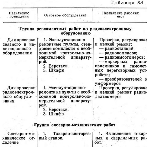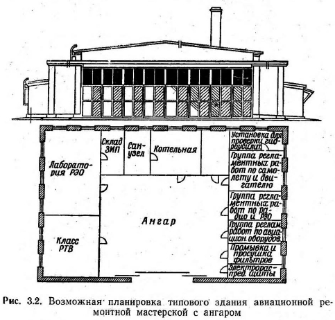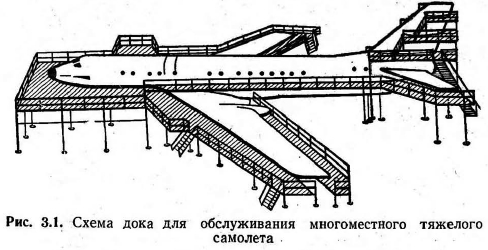 РАЗМЕЩЕНИЕ АВИАЦИОННОЙ РЕМОНТНОЙ МАСТЕРСКОЙ И ОСОБЕННОСТИ ОРГАНИЗАЦИИ РАБОЧИХ МЕСТГруппы регламентных работ размещаются в специально оборудованных помещениях, расположенных вблизи рулежных дорожек, в районе мест стоянок самолетов на удалении от них не менее 150 м. Комплекс зданий и сооружений авиационной ремонтной мастерской включает: — здание для групп регламентных работ и слесарно-механической группы с необходимыми вспомогательными и бытовыми помещениями; — ангар или открытую площадку для выполнения регламентных и ремонтных работ непосредственно на самолетах; — открытые площадки или навесы для специальных автомобилей и наземного оборудования. Опыт показал, что для выполнения регламентных работ по самолету и двигателю, особенно таких трудоемких работ, которые связаны с расстыковкой фюзеляжа, заменой двигателя, контрольной проверкой уборки и выпуска шасси, необходимы ровные площадки с твердым покрытием. Исходя из этих соображений, около помещений авиационной мастерской оборудуется специальная площадка для самолетов, находящихся на регламентных работах. Планировка и оборудование рабочих площадок в значительной мере зависят от типов самолетов, базирующихся на данном аэродроме, но все они должны отвечать определенным требованиям, которые в основном сводятся к следующему: 1. Площадка должна иметь твердое искусственное покрытие. 2. Подъездные пути, расположение и размеры рабочей площадки должны позволять: — свободный подъезд и отъезд специальных машин; — буксировку и разворачивание самолетов; — одновременное размещение двух самолетов одномоторных или одного — двух самолетов двухмоторных; — размещение необходимого наземного оборудования и снятых с самолета двигателей, капотов, сидений, удлинительных труб и т. д.; — производить запуск и опробование двигателей, а также проверку на специальной площадке радиолокационного оборудования. 3. Рабочая площадка должна быть оборудована переносными верстаками, стеллажами, стремянками, подъемниками, ложементами для укладки снятых с самолета агрегатов, а также другими приспособлениями, облегчающими труд специалистов и повышающими качество выполняемых работ. Необходимо оснащать площадки линиями водоснабжения и электроснабжения, сжатым воздухом и дренажно-канализационными системами. 4. На площадке должен быть противопожарный пост с углекислотной установкой и переносными огнетушителями. В последнее время получает распространение так называемая доковая система выполнения регламентных и ремонтных работ. Док представляет собой хорошо оборудованную рабочую площадку, позволяющую осуществить полный комплекс механизации труда в процессе выполнения регламентных и ремонтных работ на самолете. На рис. 3.1 показана схема дока для обслуживания многоместного тяжелого самолета. Доки оборудуются подвижными и неподвижными платформами, окружающими самолет и создающими необходимые удобства для выполнения работ. Оснащаются они современными техническими средствами — электрогидроподъемниками, электро- и пневмогидроинструментом для проверки систем самолетов, современными контрольно-дефектационными устройствами, машинной моечно-очистительной аппаратурой и другим оборудованием, в результате чего возможно существенное повышение производительности труда и качества 