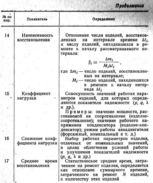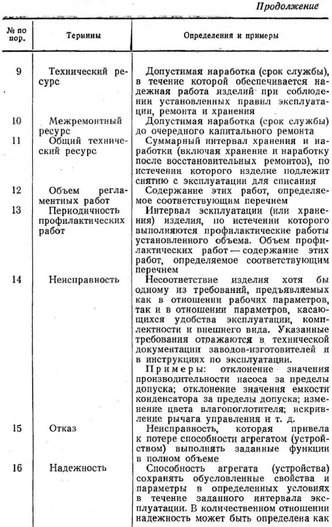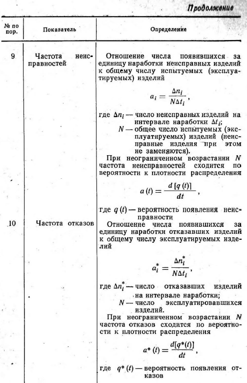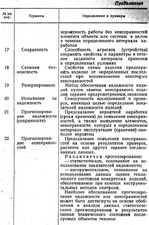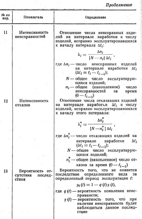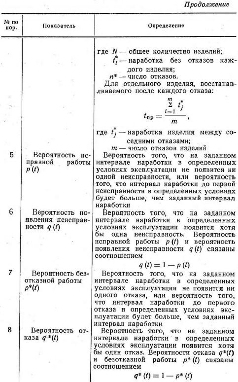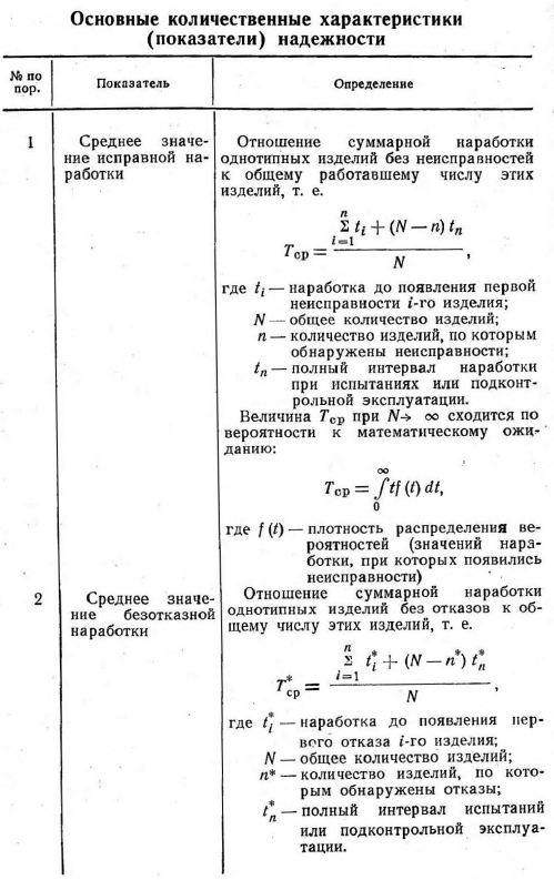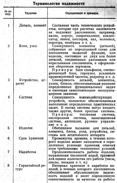 ТЕРМИНОЛОГИЯ И ПЕРЕЧЕНЬ ОСНОВНЫХ КОЛИЧЕСТВЕННЫХ ХАРАКТЕРИСТИК НАДЕЖНОСТИ (данная терминология предложена авторами)Надежность Надежностью принято называть способность технических устройств безотказно (исправно) работать в течение определенного периода времени в заданных условиях. Безотказной (исправной) работой считается нормальное выполнение устройством всех своих функций в пределах заданных допусков. Надежность тесно связана с проектированием, производством, а также с различными сторонами процесса эксплуатации устройств. Большое значение имеют вопросы восстановления свойств отказавших устройств. Чтобы объединить в одну группу смежные вопросы, надежность определяют как свойство технического устройства, обусловленное главным образом его безотказностью и ремонтопригодностью и обеспечивающее выполнение заданий в установленном объеме. Таким образом, в широком определении надежность объединяет способность безотказно работать с приспособленностью к обнаружению, устранению и предупреждению отказов. Изучение закономерностей явлений, приводящих к нарушениям работоспособности, а также изучение методов сохранения и восстановления работоспособности технических устройств составляет предмет теории надежности. Наиболее удобными для количественного описания свойств надежности являются вероятностные характеристики. ![]() ![]() ![]() ![]() ![]() ![]() ![]() ![]() ![]() Классификация испытаний на надежность Испытания на надежность являются методом экспериментального определения значений показателей надежности (сохранности). Различают испытания на надежность: — ускоренные, т. е. испытания на надежность (сохранность) в специальных условиях и режимах, обеспечивающих проведение этих испытаний в сокращенные сроки; — граничные — экспериментальная оценка области допустимых изменений параметров устройств и их элементов (деталей) в зависимости от изменений окружающих условий и режимов работы, а также применение специальных режимов работы для имитации наработки. Оценка надежности по результатам испытаний для опытной (подконтрольной) эксплуатации связана с использованием различных характеристик технического состояния изделий. Определение закономерностей изменений таких характеристик в условиях действия эксплуатационных факторов и разработка методов обеспечения требуемых (допустимых) изменений составляют важное направление работ в области надежности. Различают следующие характеристики: — эксплуатационная прочность — способность изделия выполнять заданные функции при действии механических, электрических и других или комплексных эксплуатационных нагрузок (статических, динамических, повторно-статических и др.); — статическая прочность — способность изделия выполнять заданные функции при действии на него статической (с малой скоростью приложения) нагрузки. Классификация отказов Отказы являются наиболее важной группой неисправностей. В связи с этим следует различать: — отказы в воздухе, т. е. отказы, появившиеся в период от момента принятия авиационной техники летным составом до заруливания на стоянку после окончания полетов (или от момента выхода на стартовую позицию для ракет); — отказы на земле, т. е. отказы, появившиеся и выявленные на земле при технической эксплуатации авиационной техники до ее передачи летному