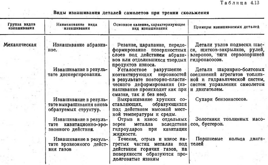 УХОД ЗА ТРУЩИМИСЯ СОЧЛЕНЕНИЯМИПод износом деталей машин понимается изменение размеров деталей в процессе работы, вызванное действием усилий на поверхности трения. Характер и интенсивность износа деталей зависят в большей степени от условий трения, удельного давления и от состояния смазки трущихся сочленений. Различают четыре вида трения скольжения: — сухое трение — между трущимися поверхностями нет смазочного материала; — жидкостное трение — смазывающая жидкость полностью отделяет трущиеся поверхности друг от друга, в этом случае при перемещении трущихся поверхностей возникает жидкостное трение, обусловленное внутренним трением частиц жидкости, т. е. трение между твердыми поверхностями заменяется трением между частицами жидкости; — полужидкостное трение — масляный слой между трущимися деталями частично разрушен и вследствие этого в отдельных местах соприкосновения деталей возникает граничное или сухое трение; — граничное трение — твердые тела отделены друг от друга тончайшим слоем смазки, находящимся под действием молекулярных сил металла. Трение скольжения характеризуется следующими коэффициентами: сухое 0,1ч-3,0; жидкостное и полужидкостное 0,0007ч-0,01; граничное 0,01ч- 0,1. Жидкостное трение не является характерным для всех трущихся сочленений самолета в силу малых скоростей скольжения и высоких удельных нагрузок, но может встречаться в быстроходных сочленениях некоторых агрегатов и двигателей самолета. Согласно современным взглядам природа износа двойственна. Она обусловлена молекулярно-механическим характером взаимодействия поверхностей сопрягаемых деталей. Соприкосновение трущихся деталей всегда происходит не по всей поверхности трения, а только на отдельных ограниченных участках, суммарная площадь которых может быть в сотни раз меньше общей площади поверхности трения. Вследствие такого рода контакта трущихся поверхностей в них развиваются высокие удельные давления, приводящие к взаимному внедрению контактирующих участков, что обусловливает механическую составляющую силы трения. Силы взаимного притяжения, возникающие между сближенными элементами поверхностей, обусловливают молекулярную составляющую силы трения. При тангенциальном смещении трущихся поверхностей происходит разрушение образовавшихся связей. В зависимости от рода взаимодействия и характера этого взаимодействия возникают различные процессы разрушения трущихся поверхностей, одновременно происходит деформирование и нагревание слоя материала, прилегающего к контакту, которые вызывают в нем физико-химические изменения. По классификации изнашивания различают два вида взаимодействия поверхностей трения: механическое (внедрение) и молекулярное (притяжение и схватывание). Рассматривая виды и закономерности износа самолетных деталей, следует учитывать особенности условий их работы: — высокие удельные нагрузки; — малые скорости скольжения; — низкие температуры поверхностей трения; — граничные условия смазки. Смазывающей средой для различных трущихся пар являются разнообразные минеральные масла или специальные рабочие жидкости с различными смазывающими и антикоррозионными свойствами и по-разному влияющие на износ деталей. Большинство деталей самолета работает в условиях, когда на трущиеся поверхности попадают 