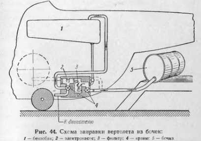 АГРЕГАТЫ И СИСТЕМЫ СИЛОВОЙ УСТАНОВКИВ предыдущих параграфах были освещены вопросы эксплуатации некоторых важных деталей и агрегатов силовых установок вертолетов, а именно: выхлопных коллекторов и муфт включения •трансмиссии, а также системы охлаждения двигателя. Это было предпринято потому, что именно они имеют наиболее существенные отличия в эксплуатации и обслуживании по сравнению с агрегатами и системами силовых установок самолетов. Другие агрегаты и системы силовой установки — топливная, масляная, система запуска двигателя и т. п. — как в конструктивном отношении, так и в эксплуатации не имеют принципиальных отличий от подобных агрегатов и систем самолетов, поэтому подробно их разбирать не следует. Ограничимся лишь краткими замечаниями по их эксплуатации и обслуживанию. Топливная система вертолета конструктивно мало чем отличается от топливной системы самолета. Топливная система вертолетов с поршневыми двигателями заправляется обычно бензином. На вертолетах Ми-4 с двигателем АШ-82В система заправляется бензином Б-95/130, на вертолетах Ми-1 с двигателем АИ-26В — бензином Б-91/Ц5, Топливные системы вертолетов с турбовинтовыми и турбореактивными двигателями заправляются керосином. Контроль за работой топливной системы вертолета осуществляется при помощи топливомеров, расходомеров, манометров давления топлива и других приборов, известных из эксплуатации самолетов. На некоторых вертолетах в конструкции топливной системы предусмотрено устройство, позволяющее пополнить запас топлива в полете и на земле из внешней емкости, находящейся как на борту вертолета, так и вне его (рис. 44). Это имеет существенное значение для вертолетов, поскольку они эксплуатируются в течение длительного времени вне аэродромов, а следовательно, при отсутствии аэродромных средств заправки. ![]() Правила заправки, слива и эксплуатации топливной системы вертолета полностью соответствуют подобным правилам для самолетов. В процессе эксплуатации при всех видах осмотров вертолета проверяется, нет ли течи из топливной системы, периодически согласно регламенту промываются и осматриваются фильтры. Все сказанное выше относится и к маслосистеме вертолетов. Эксплуатация маслосистем вертолетов Ми-I и Ми-4 осуществляется на маслах МС-20 или МК-22 и ничем не отличается от эксплуатации маслосистем на самолетах с поршневыми двигателями. Характерной особенностью эксплуатации силовых установок вертолетов является необходимость постоянного и тщательного наблюдения за состоянием гибких шлангов топливной и масляной систем в отсеке двигателя. Несмотря на наличие принудительного охлаждения, в этом отсеке, особенно вблизи выхлопного коллектора, создается высокая температура (по величине значительно превышающая температуру двигательного отсека на самолетах). Под ее воздействием гибкие шланги обгорают и растрескиваются, теряя при этом свою эластичность и прочность. Это может привести к их разрушению в полете и к пожару. Для избежания подобных случаев шланги при монтаже в отсеке двигателя следует прокладывать на возможно большем удалении от выхлопного коллектора и других наиболее горячих частей двигателя, а в ряде случаев даже изолировать от них шланги обматыванием последних асбестом с последующим покрытием жидким стеклом. Практика показывает, что в 