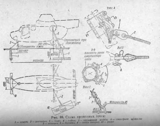 ОБОРУДОВАНИЕ СТОЯНОКПри опробовании двигателя, установленного на самолет, тяга винта или тяга реактивного двигателя направлена вперед и, чтобы исключить в данном случае перемещение самолета вперед, под его колеса устанавливают тормозные колодки или затормаживают колеса . На вертолете же при опробовании двигателя тяга несущего винта направлена вверх. Удержать вертолет на земле (у земли) при этом можно тремя способами: — привязыванием вертолета за специальные крепежные точки; — загружением вертолета с таким расчетом, чтобы максимальная тяга несущего винта была меньше или равна весу вертолета; — установкой специальных тормозов (пластин) на лопасти несущего винта (в этом случае при опробовании двигателя создаваемая несущим винтом максимальная тяга должна быть меньше веса вертолета). Первый и второй способы дают возможность не только опробовать двигатель, но и осуществить регулировку несущего и рулевого винтов. Третий способ позволяет опробовать только двигатель, но не обеспечивает регулировку несущих винтов. Для вертолетов малой грузоподъемности наиболее распространен первый способ. В данном случае действующие при опробовании двигателя на крепежные точки динамические нагрузки имеют незначительную величину, поэтому заделка крепежных приспособлений в землю особых трудностей не представляет и легко может быть осуществлена на полевых посадочных площадках. При эксплуатации вертолетов большой грузоподъемности, у которых при опробовании двигателя динамические нагрузки достигают значительных величин, крепежные приспособления должны быть заделаны в землю прочно. Очень часто их закрепляют бетоном, но это не всегда можно осуществить в полевых условиях. Одна из схем крепежных точек показана на рис. 88. Наиболее целесообразным для тяжелых типов вертолетов является сочетание третьего способа с первым, т. е. для осуществления опробования двигателя необходимо иметь на каждый вертолет комплект приспособлений, создающий необходимое торможение вращению несущего винта, а для осуществления регулировки несущих винтов после их замены или при нарушении регулировки целесообразно иметь одну оборудованную крепежными точками стоянку. ![]() При отсутствии приспособлений, создающих необходимое торможение вращению несущего винта, а также специально оборудованных крепежных точек частичное опробование двигателя можно осуществить при висении вертолета у земли. Полное опробование двигателя и проверку регулировки несущего винта в данном случае можно осуществить, загрузив вертолет таким образом, чтобы его вес был больше тяги несущего винта. Заделка крепежных приспособлений в землю и периодическая проверка надежности этой заделки являются очень важными элементами оборудования и эксплуатации стоянок вертолетов. После заделки крепежного приспособления в землю нужно испытать надежность его на расчетные нагрузки. Проверку надежности заделки на расчетные нагрузки следует производить периодически и в процессе эксплуатации, особенно после дождей. Необходимо также периодически контролировать состояние швартовочных тросов и их узлов крепления. Все это делается для того, чтобы предотвратить обрыв (вырыв) крепежного приспособления. При обрыве (вырыве) приспособления находящийся «на привязи» вертолет опрокидывается, что может п