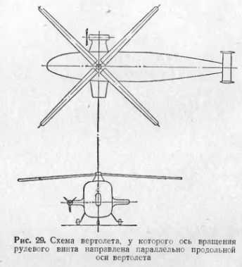ОБЩИЕ СВЕДЕНИЯРулевые винтыявляются одним из основных элементов в конструкции одновинтовых вертолетов. Установка их на данный тип вертолета обусловлена необходимостью уравновешивания реактивного момента несущего винта и обеспечения путевой управляемости. Конструкция рулевого винта включает втулку, лопасти и механизм изменения шага. Наиболее распространенными в настоящее время являются трехлопастные винты. На тяжелых вертолетах применяются четырех- и пятилопастные винты. Лопасти винтов бывают как деревянной, так и металлической конструкции. Рулевой винт, как и несущий винт, приводится во вращение двигателем через трансмиссию, а на режиме само- вращения (при отключенном двигателе)—вращающимся несущим винтом через эту же трансмиссию. Для предупреждения обледенения лопастей в полете рулевые винты оборудуются противообледенительными системами — жидкостными или электрическими. Условия работы рулевых винтов, а следовательно, и их эксплуатации во многом зависят от места установки винта на вертолете. На современных вертолетах рулевые винты могут устанавливаться в основном в двух вариантах: — аналогично самолетным винтам, когда ось вращения рулевого винта направлена параллельно продольной оси вертолета (рис. 29); — на концевой балке вертолета, когда ось вращения винта направлен перпендикулярно (рис. 30) или под углом к продольной оси вертолета. При установке рулевого винта по первому варианту условия работы и эксплуатации его мало чем отличаются от работы обычного самолетного винта. Исключением является работа винта на вертикальных режимах полета и при боковых перемещениях вертолета, на которых вертолеты, как правило, эксплуатируются непродолжительное время. ![]() Установленный в данном варианте рулевой винт не только уравновешивает реактивный момент несущего винта и обеспечивает путевую управляемость, но и сообщает вертолету тягу в направлении горизонтального полета (обеспечивает поступательное перемещение вертолета вперед). С несущего винта при этом может частично или полностью сниматься функция движителя; он обеспечивает вертолету вертикальный взлёт, поддерживает его в воздухе при поступательном перемещении и служит для управления в полете. Такая компоновка рулевого винта дает возможность получить на вертолете большую скорость горизонтального полета, чем на вертолетах с установленным рулевым винтом по второму варианту, так как несущий винт при этом работает на малых углах атаки. Однако установка рулевых винтов по первому варианту не получила широкого распространения из-за конструктивных недостатков этой схемы вертолетов. ![]() Наиболее распространенной является установка рулевого винта вертолета по второму варианту. В этом случае рулевой винт в поступательном полете вертолета вперед, кроме уравновешивания реактивного момента несущего винта и обеспечения путевой управляемости, выполняет функции вертикального оперения самолета, что улучшает путевую устойчивость вертолета. В то же время такое расположение винта вызывает некоторые особенности в его работе и эксплуатации, так как на всех режимах полета вертолета лопасти винта работают в условиях сложного обтекания (аналогично работе лопастей несущего винта в косом потоке), при котором аэродинамические и инерционные силы каждой лопасти за один
