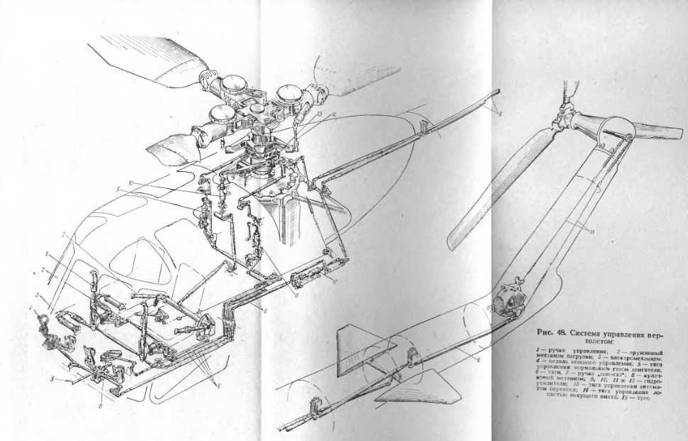 ОБЩИЕ СВЕДЕНИЯДля изменения режимов полета вертолета и парирования действующих на него внешних возмущений на каждом вертолете имеется система управления (рис. 48), при помощи которой летчик, воздействуя на несущий и хвостовой винты (или только на несущие винты в продольных, поперечных и соосных схемах вертолетов), обеспечивает требуемое положение вертолета в пространстве. Система управления вертолетом (особенно тяжелым) по конструктивному выполнению сложнее системы управления самолетом. Объясняется это наличием в ней таких сложных механизмов, как автоматы перекоса, которые не применяются на самолете, а также большим количеством гидроусилителей. Кроме этого, система управления вертолетом включает в себя специальные загрузочные механизмы, при помощи которых летчик может полностью или частично снять усилия с ручки управления. Помимо указанных механизмов и агрегатов, в передаче усилий от ручек управления и педалей на несущий и хвостовой винты принимают участие тяги, качалки и тросы. В зависимости от типа вертолета применяется либо смешанное, либо жесткое управление. На легких и средних типах вертолетов, как правило, применяется смешанное управление, т. е. оно включает в себя как жесткие тяги, так и тросы, а на тяжелых типах вертолетов — Жесткое управление, в котором тросы отсутствуют. Наиболее ответственными агрегатами системы управления являются автоматы перекоса и гидроусилители. От их безотказной и четкой работы в первую очередь зависит нормальное пилотирование и безопасность полета. Поэтому при эксплуатации вертолетов за ними требуется осуществлять особенно тщательный контроль и уход. На элементы системы управления при работающей трансмиссии, особенно в полете, действуют силы, которые меняются по направлению и величине. Источниками этих сил являются несущий и хвостовой винты. Величина сил зависит от режима полета вертолета, его полетного веса и центровки. Кроме этого, несущий и хвостовой винты являются мощными источниками вибраций. Под действием вибрационных нагрузок тяги и другие элементы управления работают на усталость. Как известно, усталостная прочность детали зависит от многих факторов, в том числе от царапин, рисок и вмятин, которые возникают при небрежной технической эксплуатации. Если учесть, что вибрации на вертолете имеют различные гармоники, а детали системы управления имеют разнообразные собственные частоты колебаний, то станет ясным, что очень трудно, а иногда даже невозможно при проектировании вертолета предусмотреть резонансные колебания и избежать их. Отсюда следует вывод, что за элементами системы управления в эксплуатации должен быть организован хороший контроль, особенно тщательный на вертолетах, надежность и живучесть которых не проверена массовой эксплуатацией. В процессе эксплуатации вертолетов в системах их управления по различным причинам появляются дефекты. Если эти дефекты вовремя не устранять, то они, прогрессируя, могут привести к частичному или даже полному отказу в работе управления. Наиболее распространенными дефектами системы управления являются люфты в сочленениях деталей, трещины тяг и качалок, завершенность и обрыв нитей тросов, разрушение подшипников. Возникновение этих дефектов является следствием неблагоприятного сочетания производственных допусков и 