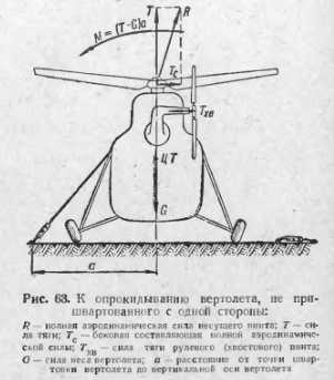 ЗАПУСК, ОПРОБОВАНИЕ ДВИГАТЕЛЯ И ВЫРУЛИВАНИЕПеред запуском двигателя летчик должен убедиться, что от вертолета убрано все наземное оборудование — стремянки, подогреватели, инструмент и чехлы, что на площадке стоянки вертолета нет камней и других посторонних предметов, а если вертолет стоит на пыльном или песчаном грунте, то место вокруг вертолета полито водой. В противном случае возможно повреждение лопастей винтов о посторонние предметы или камешками, а также иными деталями и предметами, которые могут подняться в воздух при работе несущих винтов. Особое внимание должно быть обращено на состояние тех стояночных площадок, на которых впервые включается трансмиссия вертолета, например при перелетах во время выполнения заданий. Если запуск двигателя и включение трансмиссии производится «на привязи», то вертолет должен быть надежно пришвартован. При этом, во-первых, обращается внимание на состояние наземных и вертолетных точек крепления и на состояние швартовочных тросов (не должно быть дефектов на этих элементах) и, во-вторых, на то, чтобы швартовка вертолета была осуществлена во всех точках, предусмотренных для каждого типа вертолета инструкцией по эксплуатации. Непришвартованный вертолет во время опробования двигателя (опробование возможно только при включенной трансмиссии) при оборотах двигателя, близких к номинальным. выходит на режим висения, который является одним из наиболее сложных элементов в технике пилотирования для летного состава и тем более для лиц, не имеющих летной подготовки. Поэтому непришвартованный вертолет инженерно-техническому составу опробовать запрещается, так как при этом может произойти опрокидывание вертолета. ![]() Вертолет опрокидывается при опробовании двигателя и в случае швартовки его не во всех точках. Если, например, одновинтовой вертолет не пришвартован с правой стороны (рис. 63), то до тех пор, пока сила тяги несущего винта меньше веса вертолета (тяга рулевого винта уравновешивается составляющей полной аэродинамической силы), последний устойчиво стоит на земле. Но как только сила тяги станет больше силы веса вертолета, появится момент, равный (Т — G) а, который опрокинет вертолет набок. Если при опробовании двигатель резко выходит на обороты режима висения, то вертолет опрокидывается настолько быстро, что никакими мерами удержать его от опрокидывания не удается. Если же выход на номинальные обороты происходит медленно (плавно берется на себя рычаг «шаг — газ»), то возможно в рассматриваемом случае энергичным перемещением рычага «шаг—газ» от себя и отклонением ручки циклического шага в противоположную опрокидыванию сторону удержать вертолет от опрокидывания. Убедившись, что посторонние предметы с площадки убраны и вертолет пришвартован надежно, летчик садится в кабину, осматривает ее, проверяет приборы и рычаги управления вертолетом и запускает двигатель. Особенностью запуска двигателя на вертолете является то, что двигатель запускают без нагрузки (при отключенной трансмиссии). Это может привести к раскрутке двигателя. Во избежание раскрутки перед запуском двигателя следует обратить внимание на положение коррекции и рычага «шаг — газ», которые должны соответствовать малому газу. Отключение трансмиссии вызвано тем, что несущие винты на вертолетах обладают большой мас