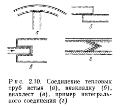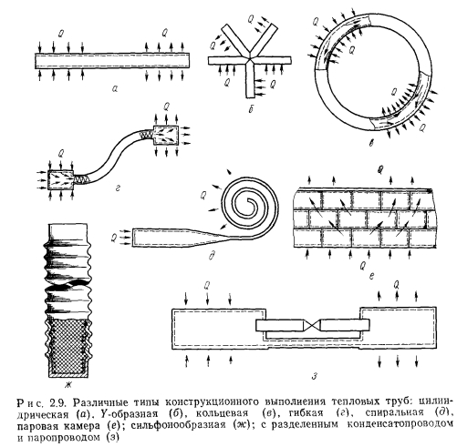 КОНСТРУКЦИОННЫЕ ФОРМЫ И МЕТОДЫ ИЗГОТОВЛЕНИЯ ТЕПЛОВЫХ ТРУБКонструкционные формы. Конструкционные формы и материалы для изготовления тепловых труб различаются чрезвычайным разнообразием в зависимости от целей и условий использования. Основные факторы, определяющие конструкционные формы, следующие: 1) цель использования; 2) взаимное расположение источника и приемника тепла, условия теплообмена; 3) температурный диапазон и редким работы; 4) воздействие полей массовых сил; 5) технологические возможности изготовителя. Примеры различных форм тепловых труб и разновидности их паровых камер приведены на рис. 2.9. Прямая цилиндрическая тепловая труба вследствие повышенной прочности и удобства изготовления корпуса получила наибольшее распространение. Цилиндрический корпус используется в различных изогнутых трубах, например кольцевых, змеевиковых, а также в трубах сложной формы, состоящих из набора сочлененных прямых или изогнутых участков. Трубы также могут иметь форму отдельных камер испарения и конденсации, соединенных конденсатопроводом и паропроводом [43] (рис. 2.9, ж). При необходимости корпус тепловых труб изготавливают из гибкого материала (рис. 2.9, з). Гибкость обеспечивается использованием металлического гофрированного тонкостенного корпуса, прорезиненной ткани, эластичных пластиков и т. п., а также применением отожженной меди (при малом числе гибов). Часто решение той или иной технической задачи достигается лишь при одновременном использовании нескольких тепловых труб, соединенных последовательно, параллельно и в любых других комбинациях. При решении вопросов температурной проводимости и температурного регулирования в таких случаях полезно использование аналогии с электрическими цепями — хорошо разработанный расчетный аппарат электротехники применим и для цепей из тепловых труб. Примеры способов стыковки тепловых труб приведены на рис. 2.10. Отметим, что при параллельной работе тепловых труб неодинаковость термических сопротивлений цепей может привести к тепловой перегрузке труб с малым сопротивлением, возможно превышение максимальной мощности и осушение труб. В таких случаях необходимо подобрать трубы с приблизительно одинаковым сопротивлением либо, если это возможно, вводить дополнительные термические сопротивления, уравнивающие сопротивление параллельных цепей. ![]() Изготовление тепловых труб. Изготовление тепловых труб включает в себя следующие операции: 1) изготовление корпуса и торцевых заглушек; 2) изготовление капиллярной структуры; 3) удаление загрязнений с поверхности деталей тепловой трубы; 4) сборка конструкции; 5) заполнение теплоносителем; 6) герметизация; 7) проверочные испытания. ![]() Материал корпуса трубы подбирается так, чтобы удовлетворить требованиям прочности и коррозионной совместимости с теплоносителем. Вопросы прочности, в частности, особенно важны для криогенных тепловых труб при температурах хранения, если теплоноситель находится в надкритическом состоянии или имеет высокое давление насыщенного пара. Иногда приходится прибегать к размещению теплоносителя при этих условиях в дополнительной емкости. Чтобы удовлетворить противоречивым требованиям прочности и совместимости, можно использовать при изготовлении корпуса сочетание двух материалов, каждый из которых выполняе