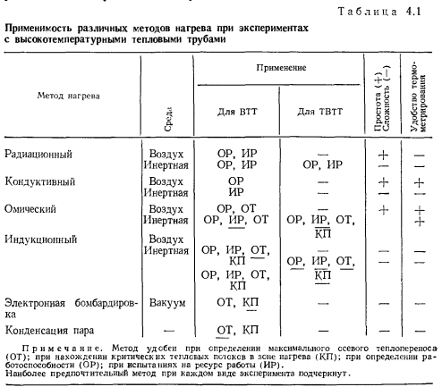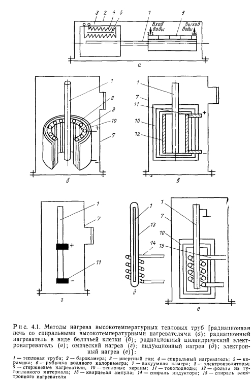 МЕТОДЫ ПОДВОДА И ОТВОДА ТЕПЛАНаряду с общими чертами тепловые трубы, предназначенные для работы на различных температурных уровнях, имеют и значительные различия. Это относится как к конструкциям тепловых труб, характеристикам этих устройств, так и к методам экспериментальных исследований, к конструкциям исследовательских стендов. При проведении экспериментов большое влияние на конструкцию экспериментальной установки обычно оказывает выбранный способ нагрева тепловой трубы и метод отвода тепла. Применяются следующие основные методы нагрева тепловых труб: радиационный, контактный (кондуктивный), омический (пропусканием тока через стенку трубы), индукционный высокочастотный, электронной бомбардировкой, циркулирующим в контуре теплоносителем, посредством конденсации пара. Наибольшие сложности вызывает нагрев высокотемпературных тепловых труб (особенно при температуре выше 700° С и необходимости обеспечивать высокие удельные тепловые потоки). Коротко охарактеризуем каждый из названных методов применительно к экспериментам с высокотемпературными тепловыми трубами. При радиационном нагреве использование электропечей на воздухе, как правило, не позволяет получить высокие удельные тепловые потоки в зоне нагрева тепловых труб. В широко распространенных печах с нихромовыми электронагревателями мощности ограничиваются наибольшей допустимой температурой для работы нихрома на воздухе, равной 1100° С. Длительность работы печей при высоких температурах невелика из-за окисления нихрома. Длительные испытания тепловых труб при температуре до 800—850° С возможны при использовании радиационных электропечей с керамическими нагревательными элементами, например силитовыми стержнями. Высокая рабочая температура этих нагревателей (около 1400° С) и длительная стойкость при работе на воздухе позволяют эффективно использовать их для проведения ресурсных и других испытаний в условиях, когда плотности теплового потока в зоне нагрева умеренные — до 100 Вт/см2. Для создания высокой удельной плотности теплового потока могут быть использованы также кварцевые криптоновые лампы большой мощности — до 10—15 кВт. ![]() Для нагрева в инертной среде и в вакууме могут быть применены нагреватели из тугоплавких материалов: тантала, молибдена, вольфрама. В зависимости от имеющихся в распоряжении источников питания могут быть применены различные конструкции нагревателей. Укладка спиралей из проволоки в керамическую изоляцию (рис. 4.1, а) позволяет использовать высокое напряжение и иметь малые токи. При изготовлении спиралей из молибденовой и вольфрамовой проволоки необходим предварительный прогрев последней до 200—300° С для обеспечения пластичности (например, посредством протяжки через отверстие в разогретой медной болванке). Нагреватели в виде беличьего колеса (рис. 4.1, б) или нагреватели цилиндрического вида (рис. 4.1, в) требуют невысокого напряжения и больших токов. При проведении экспериментов с ТВТТ необходимо обеспечивать в камерах глубокий вакуум (103 Па и ниже). Радиационные методы нагрева удобны для экспериментов: печь и тепловая труба являются автономными элементами, кроме того, можно вести наблюдения за тепловой трубой. Однако при этом методе обогрева теплоподвод весьма ограничен, а температуры нагревателей должны существенно пр