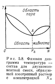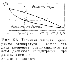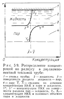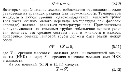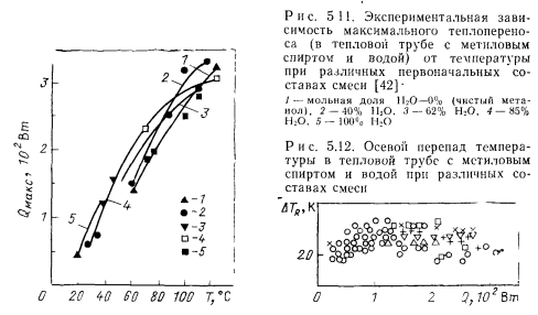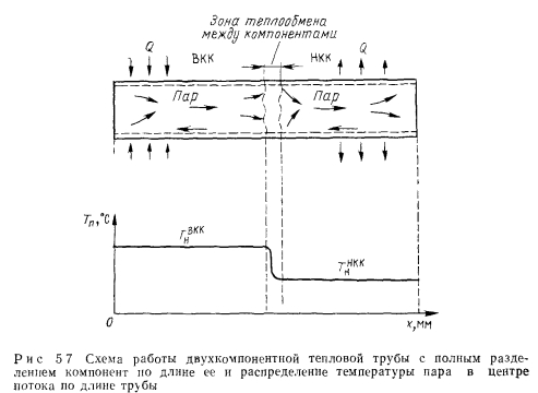 МНОГОКОМПОНЕНТНЫЕ ТЕПЛОВЫЕ ТРУБЫИнтерес к многокомпонентным (обычно двухкомпонентным) тепловым трубам вызван следующими причинами. 1. Они имеют более широкий диапазон рабочих температур по сравнению с тепловыми трубами, использующими одну из выбранных жидкостей. 2. При определенном количественном составе компонент смеси они обладают большим максимальным теплопереносом, чем однокомпонентные. 3. При концентрациях компонент теплоносителя, близких к эвтектическим, они имеют низкую температуру плавления и могут существенно упростить сложную проблему пуска тепловой трубы из состояния с замороженным теплоносителем. Азеотропные растворы не разделяются на компоненты в тепловой трубе, и также имеют пониженную температуру плавления. 4. Могут быть применены при терморегулировании. Особенности многокомпонентных тепловых труб связаны прежде всего с возможным разделением смеси на составляющие ее чистые компоненты или смеси с различной концентрацией в процессе стационарной работы тепловой трубы. Разделение, с одной стороны, ведет к повышению термического сопротивления тепловой трубы, с другой — в отдельных случаях может увеличить ее мощность. Вопрос о разделении смеси на чистые компоненты является одним из основных вопросов теории и эксперимента многокомпонентных тепловых труб. Как правило, рассматриваются двухкомпонентные тепловые трубы. Известно, что для стационарной работы любой тепловой трубы, в том числе и двухкомпонентной, необходимо соблюдение двух условий. Во-первых, необходим баланс масс — в каждом сечении тепловой трубы массовый расход пара G должен быть равен массовому расходу жидкости L, т. е. ![]() На рис. 5.6 представлена типичная диаграмма температура кипения—состав для двухкомпонентной смеси веществ. Исходя из условия баланса масс, работа тепловой трубы на диаграмме изобразится линией АВ, т. е. средние массовые доли пара У и жидкости X в каждом сечении трубы равны между собой. Однако из второго условия вытекает, что пар, находящийся в термодинамическом равновесии с жидкостью, должен быть обогащен более низкокипящей компонентой (НКК). Это означает, что жидкость в точке В, имеющая состав Хи будет хотя бы приближенно находиться в термодинамическом равновесии с паром в точке С, имеющим состав У2. На первый взгляд, требования баланса масс и термодинамического равновесия в двухкомпонентной тепловой трубе противоречат друг другу. Это противоречие привело авторов первых исследований [37, 38] к предположению, что в стационарном режиме в двухкомпонентной тепловой трубе происходит полное разделение компонент смеси п образуются два контура из чистых теплоносителей, соединенных между собой коротким участком с переменным составом (рис. 5.7). Зона высокотемпературного теплоносителя занимает часть тепловой трубы со стороны испарителя, ![]() ![]() Степень разделения смеси на чистые компоненты зависит от давления паров, входящих в смесь чистых компонент. Разделение смеси на чистые компоненты более вероятно, если тепловая труба заправлена смесью с сильно различающимися для чистых компонент давлениями паров. Помимо типа раствора разделение его на чистые компоненты зависит также и от его температуры. Эта зависимость выражается законом Вревского [43]: при повышении температуры раствора в равновесных парах повышается относител
