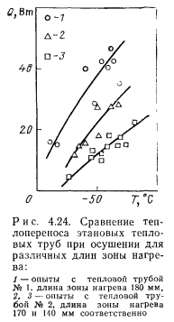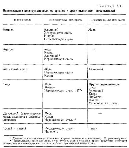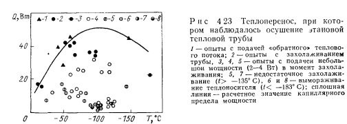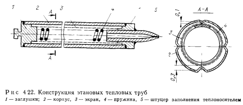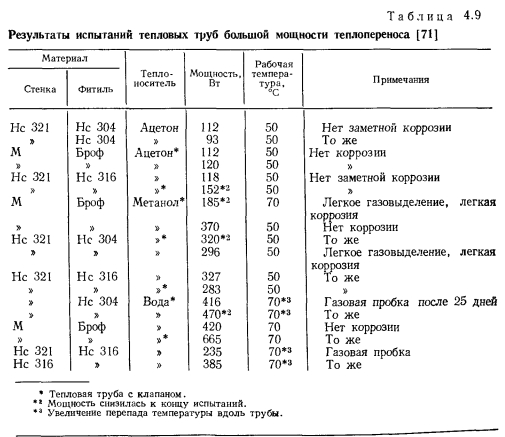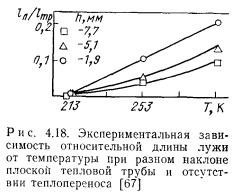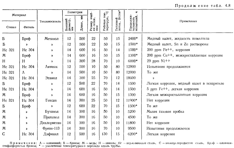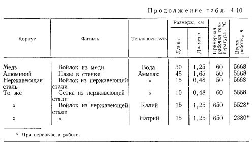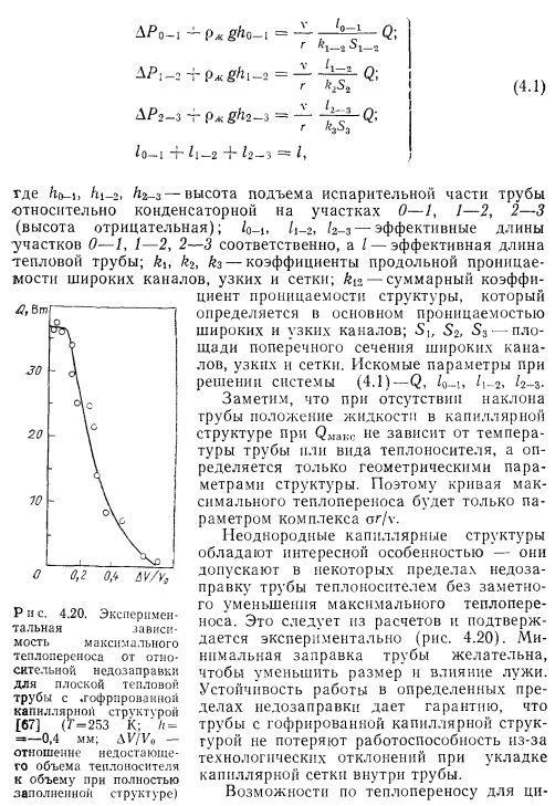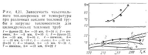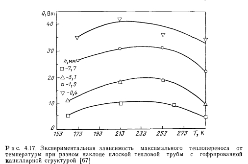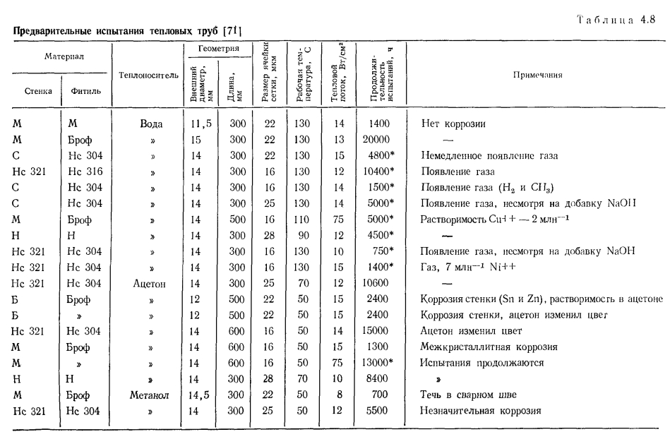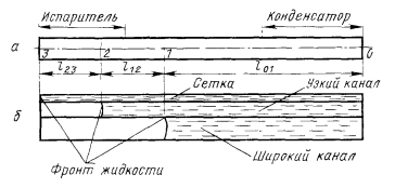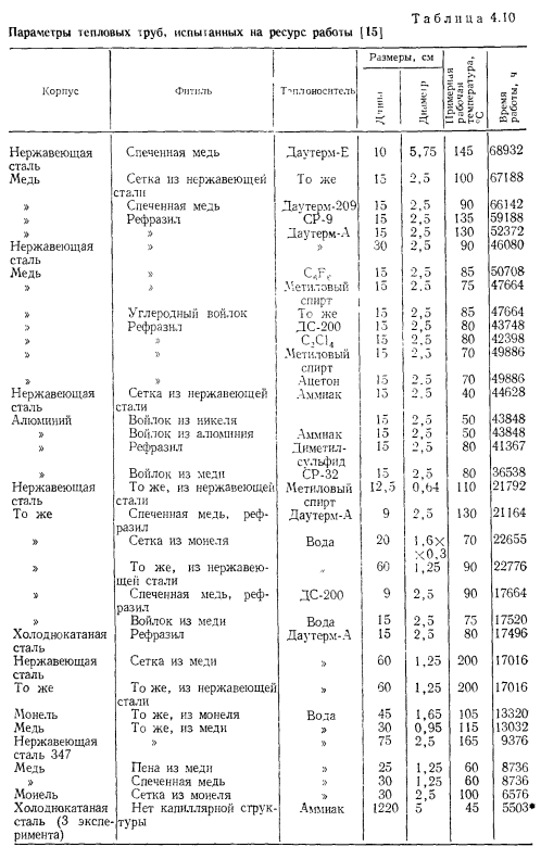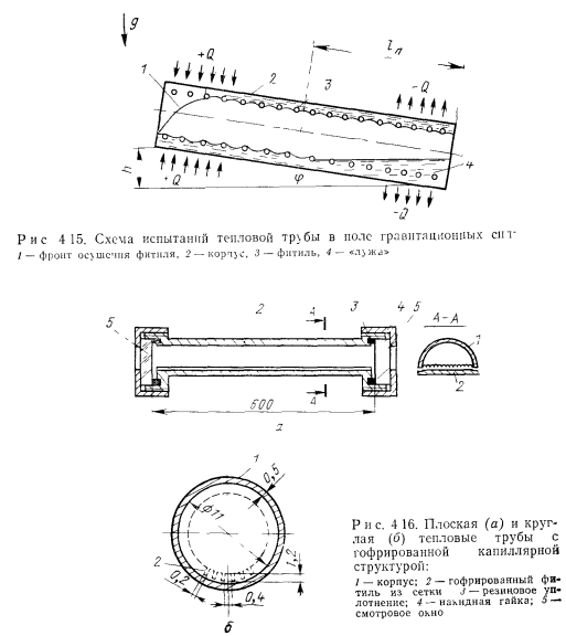 НИЗКОТЕМПЕРАТУРНЫЕ И КРИОГЕННЫЕ ТЕПЛОВЫЕ ТРУБЫЭкспериментальному и расчетному исследованиям характеристик низкотемпературных и криогенных тепловых труб посвящено большое число работ [31—69]. При разработке низкотемпературных тепловых труб различных типов возникают специфические задачи. Отметим наиболее важные из них: 1. Изучение механизма теплопереноса при наличии силы тяжести и экстраполяция данных, полученных в наземных условиях на случай, когда сила тяжести отсутствует. 2. Достижение оптимальных характеристик тепловых труб, в частности высокого теплопереноса. 3. Выбор теплоносителей и материалов, совместимых друг с другом. 4. Ресурсные испытания Механизм теплопереноса при наличии массовых сил и при их отсутствии. Для тепловых труб, работающих в широком интервале температур, в частности для криогенных труб, зачастую велики изменения объема теплоносителя. Труба, заполненная теплоносителем с небольшим избытком жидкости, рассчитанным на наименьшую рабочую температуру, как правило, имеет объем избыточной жидкости в нижней своей части (рис. 4.15). Из-за плохих теплофизических свойств низкотемпературных теплоносителей при больших углах наклона трубы к горизонту ф зачастую трудно обеспечивать заполнение фитиля в верхней ча.сти трубы, поэтому приходится вести эксперименты при малых наклонах. При повышенных температурах объем лужи оказывается велик, значительной оказывается ее протяженность. Поскольку можно практически не считаться с гидравлическим сопротивлением при переносе жидкости в луже, в эффективную длину трубы не входит занятый лужей участок 1„ (см. рис. 4.15). Этот фактор приводит к увеличению максимальной переносимой мощности. Воздействие гидростатического столба жидкости ведет к неоднородности гидродинамической картины по радиусу трубы, В совокупности с воздействием гидростатического столба, обусловленного наклоном трубы, этот эффект уменьшает максимальную переносимую мощность по сравнению с переносом в условиях невесомости. Следует отметить, что при малом капиллярном, напоре фитиля возможно осушение фитиля в верхней части, а соответственно и увеличение объема и протяженности лужи. При этом фронт осушения фитиля имеет вид, качественно представленный на рис. 4.15. Задача гидродинамического расчета тепловой трубы становится двухмерной. ![]() Значительное влияние на работу тепловых труб с канавочной гофрированной капиллярной структурой оказывают силы гравитации [67]. Для того чтобы исключить многомерность задачи, часть опытов проводили на тепловой трубе с плоским фитилем из гофрированной сетки (рис. 4.16,а). Фитиль изготовлен из никелевой односторонней сетки саржевого плетения 80/720 ТУ16-538.082—70 (основа из проволоки диаметром 0,052 мм. уток — из проволоки диаметром 0,035 мм). Гофрирование было проведено таким образом, что структура получилась неоднородной; узкие каналы чередовались с широкими. Движение жидкости в капиллярной структуре осуществлялось по широким закрытым каналам, узким открытым каналам и по самой сетке саржевого плетения. Длина трубы составляла 600 мм, ширина фитиля — 15 мм. Торцевые заглушки были выполнены из стекла, что позволило визуально наблюдать за поведением жидкости в тепловой трубе. Подвод тепла осуществлялся от электрического нагревателя на длине 140 мм, отвод (с помощью медной охлаждаем