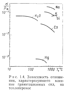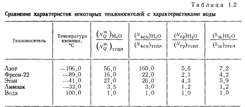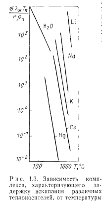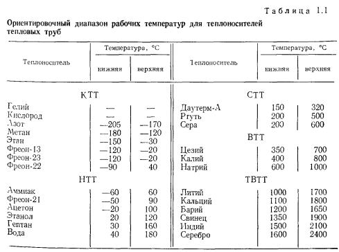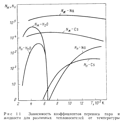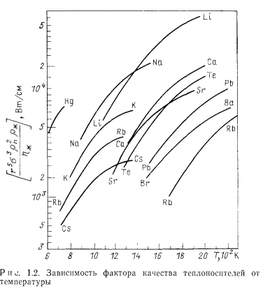 ТЕПЛОФИЗИЧЕСКИЕ ОСНОВЫ ВЫБОРА ТЕПЛОНОСИТЕЛЯДля возможностей теплоносителя по теплопереносу в тепловых трубах в работе [4] предложено использовать комплексы, названные коэффициентами переноса жидкости и пара и равные соответственно ![]() Коэффициент переноса жидкости имеет максимум при определенной температуре для каждой жидкости и падает до нуля в критической точке. Характер зависимости коэффициента переноса пара от температуры качественно аналогичен, однако максимум располагается при иной температуре. Выбирая теплоноситель для заданного интервала температур, нужно стремиться к тому, чтобы теплоноситель имел наибольшие значения и NQ . Максимум теплопереноса для тепловых труб располагается в интервале температур между максимумами Л? и NQ- Положение его зависит от геометрических размеров трубы, характеристик капиллярного устройства, от ориентировки в поле массовых сил. Nn и ЛД при оценке положения максимума должны входить со своим статистическим весом, пропорциональным изменению давления в паре и в жидкости, которые будут компенсироваться капиллярным напором. На соотношение этих давлений влияет местоположение «мокрой» точки. На рис. 1.1 представлены изменения коэффициентов переноса пара и жидкости для некоторых веществ в зависимости от температуры. Как показано в работе [5], для коротких тепловых труб, работающих при больших числах Рейнольдса (Re>l) и имеющих капиллярную структуру в виде составного фитиля с кольцевым зазором, учет теплофизических свойств теплоносителя сводится к величине, которая названа фактором качества и определяется как ![]() Отметим, что такой тип капиллярной структуры наиболее применим для металлических теплоносителей. На рис. 1.2 представлено значение Ф для некоторых металлов. Задержку вскипания можно охарактеризовать комплексом ![]() Значение этого отношения пропорционально высоте капиллярного поднятия жидкости при наличии сил гравитации. Афр для разных теплоносителей дан на рис. 1.4 в зависимости от температуры. Рассмотрим вкратце характеристики различных теплоносителей. Каждый теплоноситель способен эффективно переносить тепло лишь в ограниченном интервале температур (табл. 1.1). Для различных температурных уровней имеющиеся теплоносители сильно различаются своими способностями осуществлять перенос тепла. В целом следует отметить, что по мере понижения уровня температуры и соответственно использовании подходящих для этого уровня теплоносителей наблюдается ухудшение теплофизических свойств (уменьшение г, а, к, увеличение цж). Это влечет за собой в первую очередь ухудшение такой важной характеристики, как максимальная переносимая мощность, обусловленная капиллярными ограничениями. Из-за понижения теплопроводности увеличиваются термические сопротивления фитилей, облегчается вскипание жидкостей, увеличивается относительное влияние сил гравитации. ![]() Теплоносители низкотемпературных и криогенных тепловых груб. В области низких температур теплоносители обладают сравнительно плохими теплопередающими свойствами. Теплота парообразования и коэффициент поверхностного натяжения для них малы, а вязкость жидкости велика. Тем не менее и криогенные тепловые трубы весьма эффективны по сравнению, например, с медными тепловодами. Из табл. 1.2 видно ухудшение характеристик теплоносите