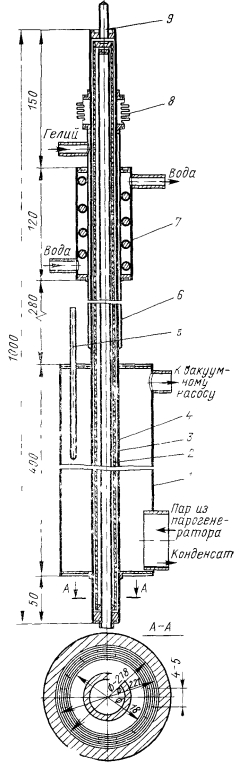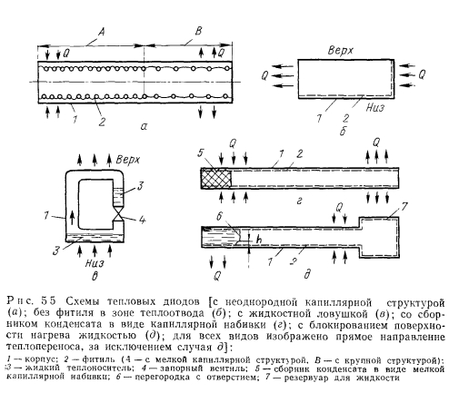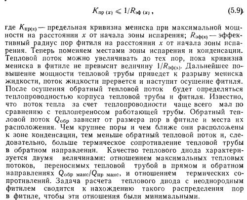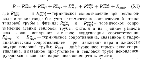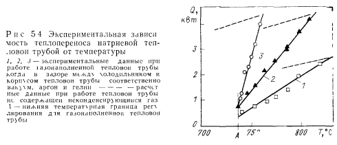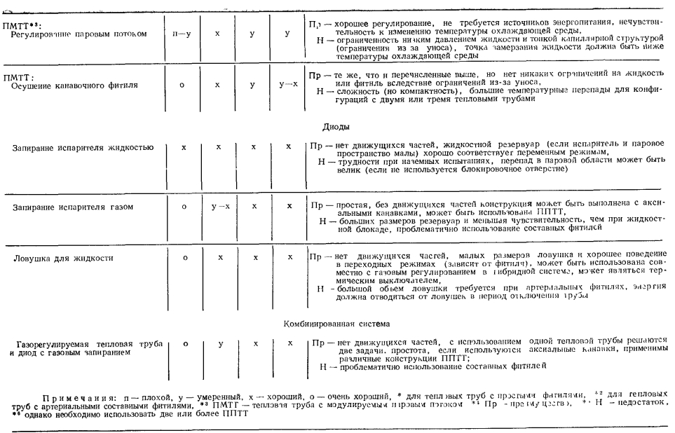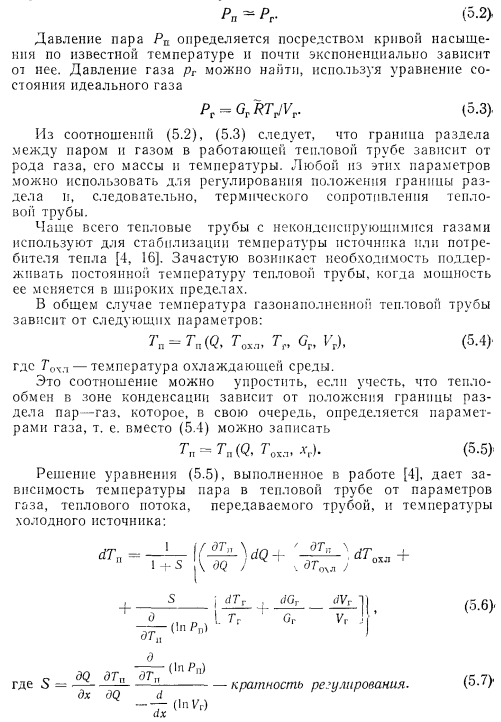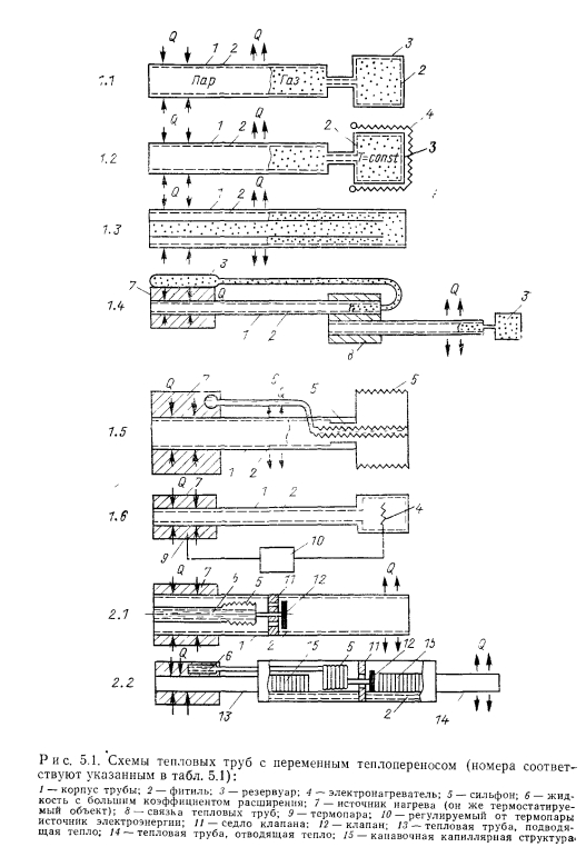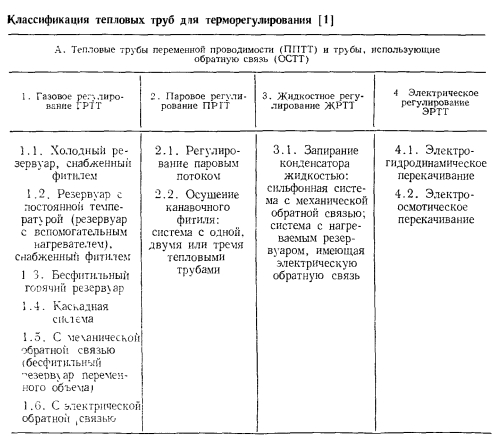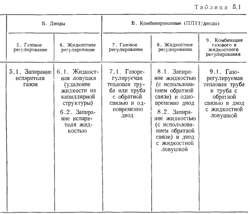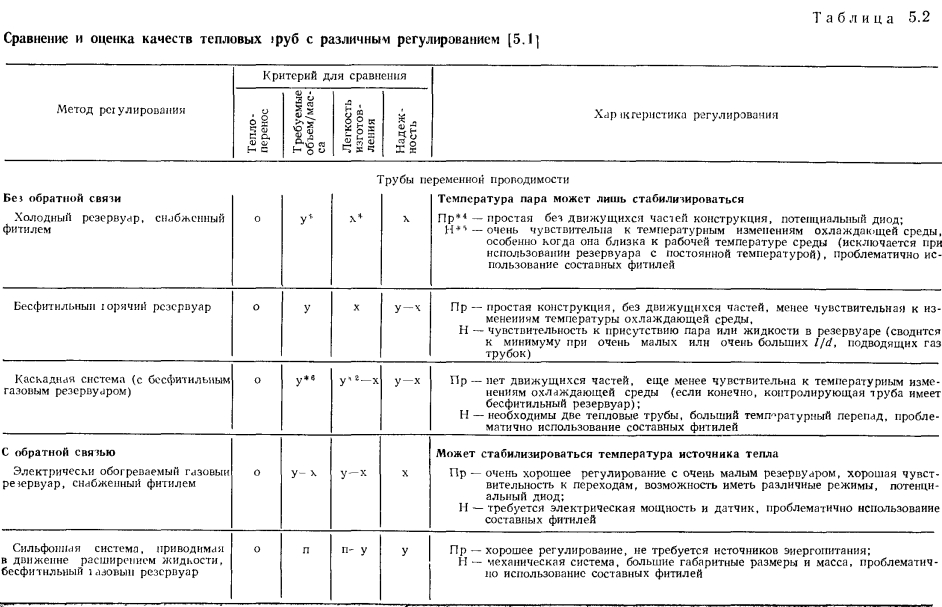 ТЕПЛОВЫЕ ТРУБЫ ПЕРЕМЕННОЙ ПРОВОДИМОСТИОдним из основных достоинств тепловых труб является их высокая тепловая проводимость. Однако очень часто возникает необходимость регулировать эту проводимость для того, чтобы либо изменять количество передаваемого трубой тепла, либо поддерживать необходимый уровень температуры греющей или нагреваемой среды при изменении теплоподвода. Представляют интерес два случая регулирования проводимости тепловых труб — ступенчатое и плавное. При ступенчатом регулировании тепловая труба работает либо в режиме максимального теплопереноса (положение «включено»), либо минимального (положение «выключено») В общем случае ступенчатое регулирование подразумевает и обеспечение некоторых промежуточных значений проводимости. При плавном регулировании теплоперенос тепловой трубы меняется плавно в широком диапазоне изменения параметров. Особый случай регулирования осуществляется с помощью тепловых диодов, в которых тепло эффективно переносится лишь в одном направлении, а при передаче тепла в противоположном направлении диод является тепловым изолятором. Конечно, чаще всего идеальной теплоизоляции при этом не достигается. В общем случае термическое сопротивление тепловой трубы складывается из следующих составляющих: ![]() Для регулирования теплопереноса тепловой трубы можно использовать любое из этих семи термических сопротивлений. Однако обычно изменяют термические сопротивления: ![]() Если обратиться только к тем способам регулирования, которые непосредственно связаны с работой самой тепловой трубы, то можно дать классификацию тепловых труб в отношении терморегулирования в виде, представленном в табл. 5.1 [1]. В этой классификации приведены трубы переменной проводимости при передаче тепла в одном направлении, диодные трубы п комбинированные системы, обеспечивающие как переменный теплоперенос, так и диодные свойства трубы. При этом для регулирования могут использоваться или не использоваться дополнительные системы обратной связи, т. е. механические или электрические приспособления, воздействующие на тепловую трубу при изменении ее параметров. Тепловые трубы без специальных систем обратной связи способны осуществлять лишь стабилизацию температуры пара, при наличии обратной связи чаще всего выполняют задачи по стабилизации температуры источника тепла. Примеры устройства тепловых труб с различным регулированием схематически даны на рис. 5.1. Краткая оценка качеств некоторых типов тепловых труб представлена в табл. 5.2 [1]. ![]() Газорегулируемые тепловые трубы. Этот способ регулирования наиболее широко распространен в практике применения тепловых труб переменного теплопереноса. Уже в первых опытах с тепловыми трубами [2] было замечено, что не полностью удаленный из трубы неконденсирующийся газ при ее работе накапливается в конце зоны конденсации, образуя газовую «пробку». Газ препятствует проникновению пара в занятую им область трубы, создает дополнительное диффузионное сопротивление тепло- и массопереносу. Эксперименты показывают [3], что диффузионное термическое сопротивление в десятки и сотни раз может превышать термическое сопротивление при конденсации чистого пара. Часть поверхности тепловой трубы, занятая газом, практически не участвует в теплообмене. При большой акс
