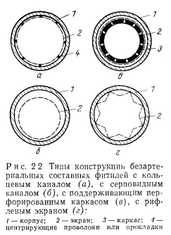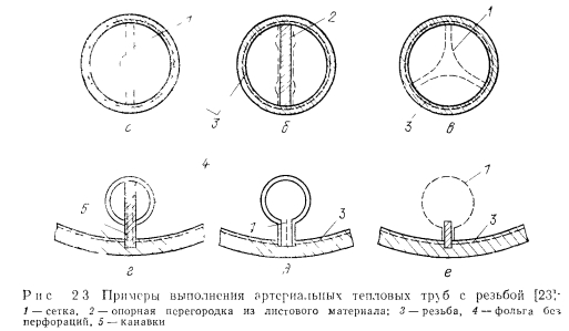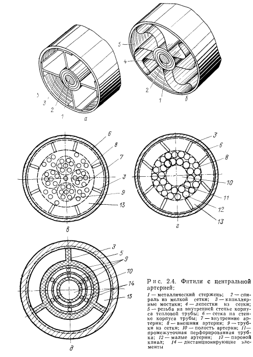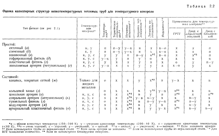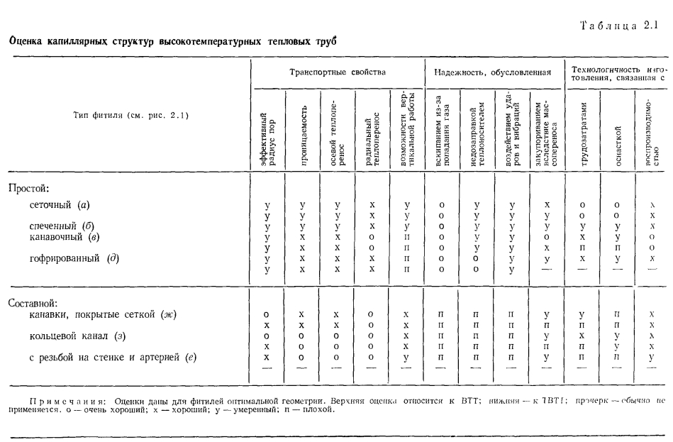 ВЫБОР ТИПА КАПИЛЛЯРНОЙ СТРУКТУРЫПри выборе капиллярной структуры для тепловой трубы следует исходить прежде всего из комплексной оценки ее качеств, таких, как: 1) транспортные свойства по отношению к тепло- и массопереносу; 2) надежность; 3) технологичность изготовления; 4) моделирование рабочих условий. Остановимся на каждом из указанных качеств капиллярной структуры. Высокий теплоперенос в тепловой трубе возможен лишь при благоприятных транспортных свойствах фитиля — малом эффективном радиусе пор, создающих высокое капиллярное давление, большом гидравлическом диаметре каналов и суммарной площади сечения для протока жидкости вдоль трубы, обеспечивающих в целом малое гидравлическое сопротивление при течении жидкости. Одновременное выполнение первых двух условий возможно лишь в составных фитилях. Однако составные фитили имеют крупные недостатки и их применение не всегда допустимо. Для простых фитилей существует задача оптимизации, относящаяся к выбору размера каналов и их числа. При малом размере канала увеличивается движущий капиллярный напор, однако при этом возрастают гидравлические потери в жидкости, и наоборот. Большое число капиллярных каналов и соответственно большая толщина фитиля уменьшают гидравлические потери в жидкости, но при заданном размере внутреннего диаметра корпуса трубы увеличивают потери давления в паровой фазе. К транспортным свойствам фитиля можно отнести эффективную теплопроводность и способность к передаче тепла в радиальном направлении без наступления критической ситуации (перегрев стенки, резкое повышение термического сопротивления трубы). В наземных условиях к фитилю также часто предъявляют требование, чтобы при наклонном или вертикальном положении трубы, работающей с использованием силы тяжести, жидкость заполняла фитиль как минимум на высоту зоны нагрева. Транспортными свойствами фитиля определяется и работа тепловой трубы в пусковых режимах. Эксперименты показывают, что трудно, а иногда и невозможно добиться пуска тепловых труб с крупной капиллярной структурой. Надежность в данном случае следует понимать как характеристику вероятности выхода трубы из строя из-за протекания разнородных процессов, на которые влияют факторы, различные для каждого процесса. Как для простых, так и для составных фитилей (хотя, конечно, в различной степени) опасным является разрушение пористой структуры фитиля или закупорка пор вследствие массопереноса. В некоторых случаях излишки теплоносителя при неточной заправке могут выводить тепловую трубу из строи или делать ее характеристики неприемлемыми. Для труб с составными фитилями совершенно недопустима недозаправка. Трубы с составными фитилями, как уже указывалось, очень чувствительны к попаданию газа в канал для жидкости. Газовые пузырьки, находясь в области нагрева, инициируют вскипание, осушение составного фитиля и приводят к перегреву и даже разрушению трубы. Для вторичной подготовки к работе в этом случае, как правило, требуется проведение специальных операций. Воздействие ударов и вибраций особенно опасно для составных фитилей, так как «выбивание» части жидкости приводит к упомянутым выше эффектам. ![]() Технологичность изготовления включает в себя несколько характеристик Это трудозатраты на изготовление и очистку фитиля, ос