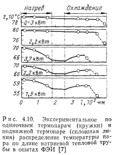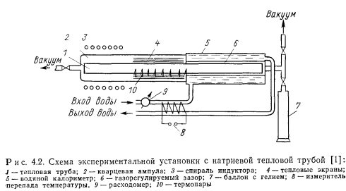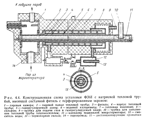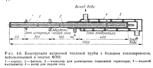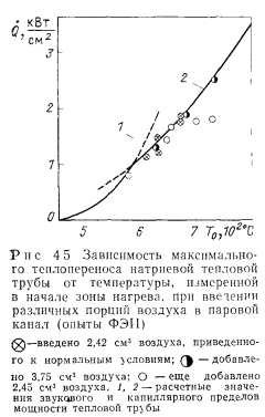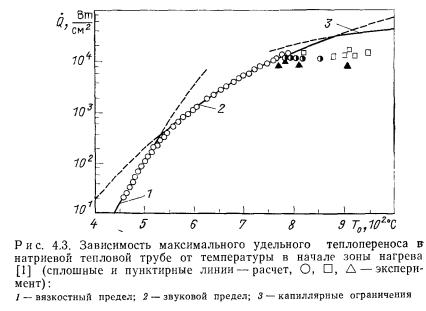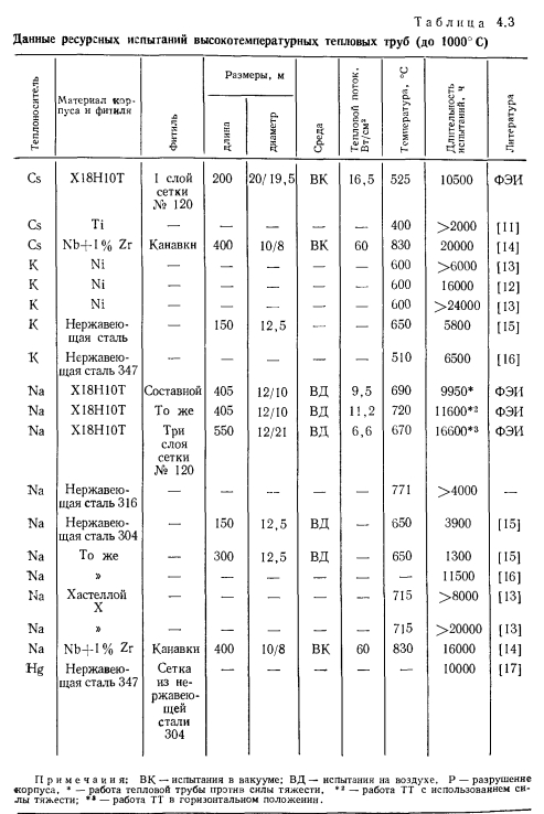 ВЫСОКОТЕМПЕРАТУРНЫЕ ТЕПЛОВЫЕ ТРУБЫДля тепловых труб со щелочно-металлическими теплоносителями (натрием, калием, рубидием, цезием) в целом характерен высокий теплоперенос. Эти теплоносители совместимы с такими широко распространенными конструкционными материалами, как нержавеющие стали и сплавы на основе никеля. Данные тепловые трубы могут обеспечить длительный ресурс работы при условии хорошей очистки корпуса трубы, фитиля и теплоносителя от нежелательных примесей, прежде всего кислорода. Натрий имеет очень благоприятные теплофизические свойства и в диапазоне температур 650—1000° С наиболее приемлем. Калий обычно применяют лишь в тех случаях, когда необходимо обеспечить изотермичность трубы и высокий теплоперенос при температурах 550— €50° С, т. е. в том диапазоне температур, где для натрия давление паров слишком мало. Рубидий и цезий имеют сравнительно малое поверхностное натяжение и ухудшенные по сравнению с натрием и калием другие физические свойства. Их следует использовать лишь при 400—550° С там, где требования по теплопереносу относительно невелики, и, главным образом, необходимо обеспечить изотермичность. ![]() Рассмотрим наибольший осевой и радиальный теплоперенос для характерных конструкций тепловых труб, а также достигнутый ресурс работы для тепловых труб различных конструкций. Теплоперенос. Для тепловых труб с составными фитилями могут быть получены наилучшие результаты по теплопереносу. Наибольший удельный теплоперенос (на единицу поперечного сечения парового канала) был достигнут в опытах Винца и Буссе с натриевой тепловой трубой [1] (рис. 4.2). Опыты проводились на цилиндрической горизонтальной трубе длиной 500 мм с корпусом из нержавеющей стали диаметром 12 мм и толщиной стенки 1,5 мм. Труба имела 27 продольных прямоугольных канавок шириной 0,5 и глубиной 0,6 мм, покрытых сеточным экраном с максимальным эффективным диаметром пор 11 мкм. Технология изготовления фитиля описана в § 2.3. Поверхностная пористость фитиля оценивается 20%. Труба заполнялась натрием с использованием горячей геттерной очистки с последующей дистилляцией, натрия. Нагрев осуществлялся индукторами длиной 35 и 110 мм. Нагреваемая и адиабатическая части трубы находились в кварцевой ампуле. Адиабатическая зона имела длину 245 и 160 мм. В охлаждаемой зоне на длине 200 мм тепло отводилось водой через наполняемый гелием газорегулируемый зазор. ![]() Результаты измерений максимального теплопереноса представлены на рис. 4.3. Зависимость теплопереноса от температуры можно разделить на три области. При 460—530° С имеют место вязкостные ограничения теплопереноса, при которых плотность теплового потока изменялась пропорционально изменению р"0Р"0 (где 0 означает, что плотность и давление пара взяты при температуре Т0 в начале зоны испарения). Измерения проводились с короткой индукционной катушкой (длиной 35 мм). В интервале температур 530—790° С наблюдались звуковые ограничения теплопереноса — плотность теплового потока увеличивалась уже пропорционально. Эксперименты по измерению теплопереноса проводились с коротким и длинным индукторами. Наибольшее значение радиального теплового потока достигало 1,25 кВт/см2 (отнесено к площади внутренней поверхности тепловой трубы) при 7о = 750°С и плотности осевого теплового потока, равной 11,2 кВт/см2. В интервале температур 720