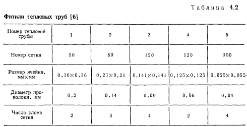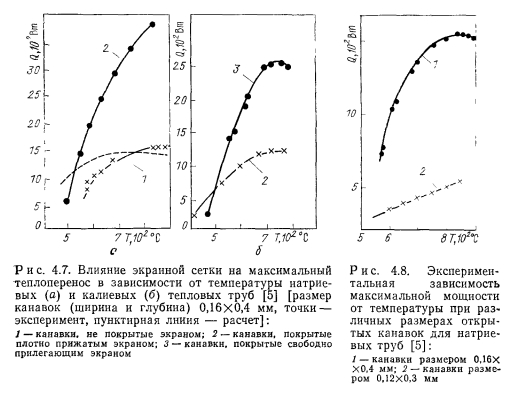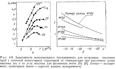 Тепловые трубы с сеточной капиллярной структурой исследовались в работе Шмидта и Семерия [6]. Изучалось влияние размеров сеток и угла наклона трубы на максимальную мощность натриевых тепловых труб с простым фитилем из нескольких слоев металлической сетки с квадратной ячейкой. Фитиль прижимался к стенке трубы спиральной пружиной. Размер ячеек сетки изменялся для каждой трубы. В табл. 4.2 представлены геометрические характеристики фитилей экспериментальных тепловых труб. Диаметр корпуса трубы 25 мм, толщина 2 мм и длина 200 мм. Трубы нагревались индукционным методом, теплосъем регулировался составом смеси газов в кольцевом зазоре между тепловой трубой и водяным калориметром. Опыты проводились при различном наклоне тепловой трубы. На рис. 4.9, а представлены результаты экспериментов с тепловой трубой № 2 при различных температурах и углах наклона. Кривые ограничения мощности имеют свой максимум при определенной температуре для каждого угла наклона. На рис. 4.9, б представлены пересчитанные, исходя из экспериментальных данных, характеристики тепловых труб с разными сетками, но одинаковым числом слоев этих сеток, равным трем. Из представленных характеристик следует, что тепловая труба с сеткой № 80 должна передавать самые большие количества тепла. Сетка № 300 имеет малую проницаемость, хотя и способна создавать высокое капиллярное давление. ![]() Для изучения характеристик теплопереноса и полей температуры насыщения вдоль парового канала в Физико-энергетическом институте были проведены эксперименты с натриевой тепловой трубой, в которой в качестве «простого» фитиля использовалась сетка саржевого плетения [7]. Экспериментальная установка состояла из тепловой трубы с излучательной нагревательной печью и воздушным холодильником, а также из системы дистилляцнонной очистки и дозировки подаваемого в тепловую трубу натрия. Труба горизонтально располагалась внутри барокамеры, наполняемой аргоном. Длина трубы составляла 500 мм, диаметр 28,5 мм, толщина стенки 1,5 мм. Внутри трубы в три слоя по спирали уложена сетка саржевого плетения С80 ГОСТ 3185-65 из нержавеющей стали (диаметр проволоки основы — 0,35 мм, диаметр утка — 0,25 мм). Диаметр парового канала трубы 20,5 мм, основа сетки с осью трубы составляла угол 7°. Через каждые 100 мм для крепления сетки установлены тонкостенные кольца. Нагрев трубы осуществлялся на длине 180 мм, теплоотвод — на длине 245 мм. Для измерения температуры пара в семи сечениях по длине парового пространства трубы в гильзах размещались хромель-алюмелевые термопары. ![]() Передаваемое по трубе тепло определялось по расходу и подогреву воздуха. Температура, измеренная по длине трубы при различном теплопереносе, дана на рис. 4.10. Рассмотрение перепадов давления в паровой и жидкой фазах в режиме с наибольшим теплопереносом (3,7 кВт) приводит к кажущемуся несоответствию. Максимальное капиллярное давление, рассчитанное по размеру пор сетки и равное 2-103 Па, намного меньше действительного перепада давления в паровой фазе, которое выше 7-103 Па. Это кажущееся противоречие можно объяснить следующим образом. Внутри саржевой сетки имеются непрерывные каналы, в которых радиусы кривизны менисков могут быть много меньше, чем в порах на поверхности сетки. Эти каналы клиновидной формы образованы проволокой основы и вплотную уложенной на ней 